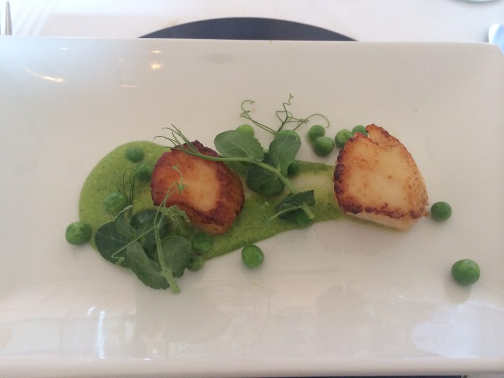 The next Melton’s sea food course of scallops was also superbly presented: two pan-fried examples nestling over pea puree. Comparing inevitably to last Sunday’s meal at the Star the scallops were a touch over cooked, lacking a final few percent of taste and moisture in their core, but still a satisfying course sliced through with pea flavour.