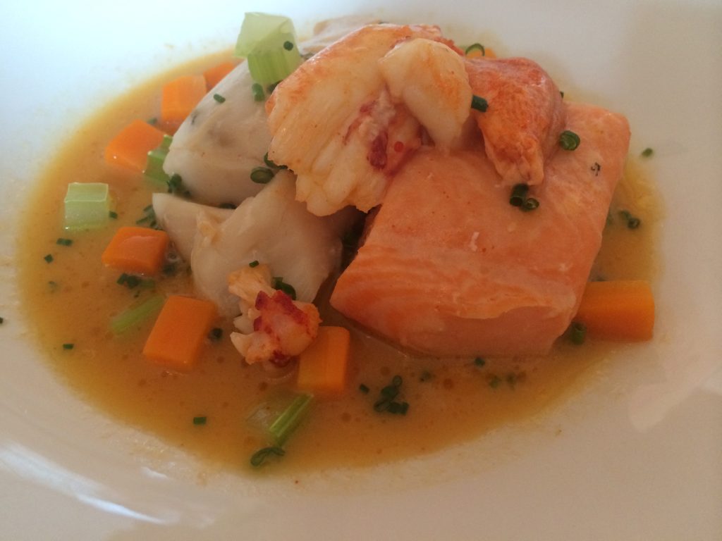 Please don’t forget that all this time we’ve the simulacrum of superiority shouting in our ears, even drowning out our own attempts at conversation. Thoughts of the Sydney opera house, Australian wildlife and how best to obtain partial refunds on Wimbledon tickets hammered their way across the room. Sighing onwards, we tucked into lobster and fish: white fish and salmon, somehow miraculously boneless, resting amongst small cubes of carrot and celery, As with previous courses, the fish was topped with lovely sauce that didn’t rely on over-salting for taste.