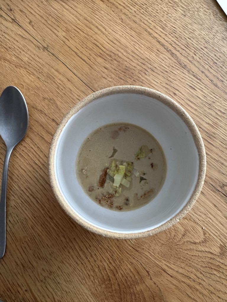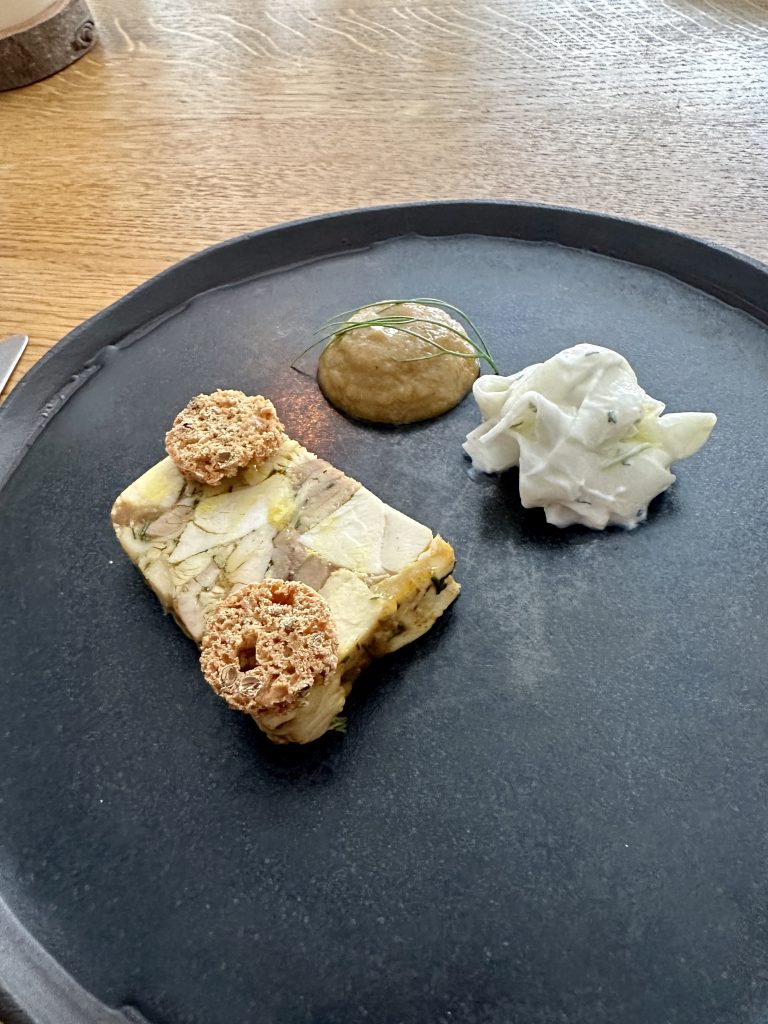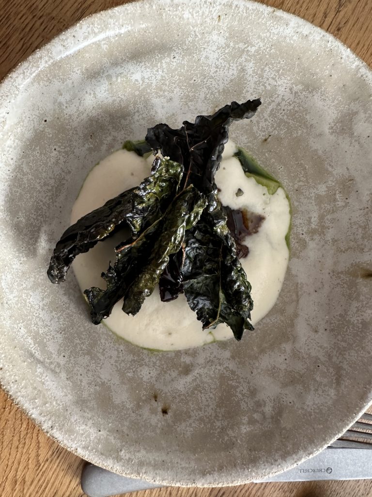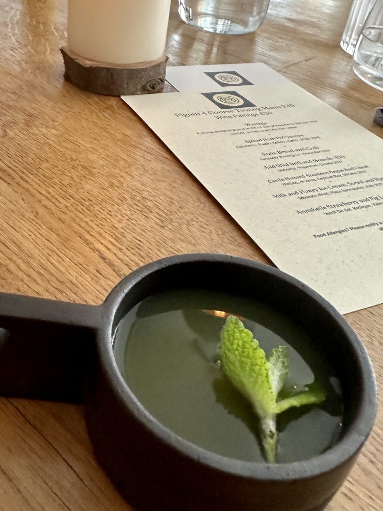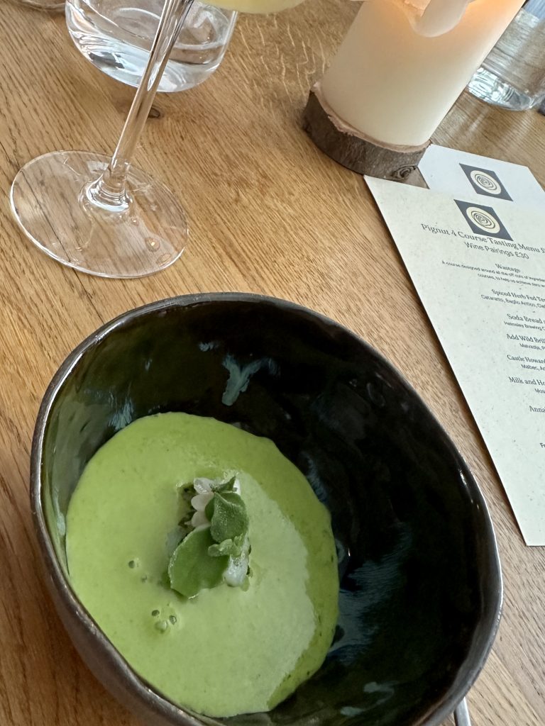 Pignut is an unassuming building just off the market square in Helmsley that’s simply decorated without feeling sparse and had a welcoming buzz on the Friday lunchtime of our visit. There’re a couple of menu options and we were to sample the four course menu which weighs in at £45 and has several options to upgrade, each of which makes sense and doesn’t feel like added pressure to spend. The first course is the intriguingly titled “Wastage” which was actually served in three parts, intended to underscore the potential of off-cuts that would otherwise go to waste. Chefs finding creative ways to push their margins up by getting more out of their produce is by no means a new concept but putting that front and centre in such an explicit way is rather bold, as well as fully justified by the execution here. A boldly herbed and refreshing drink leads us into a second plate featuring pickled trim from Brill amongst a richly vegetal liquid for a quite remarkable contrast. The last part of the trio featured potato and crab in a dish reminiscent of a bisque that felt far more luxurious than you’d imagine “Wastage” could ever be.