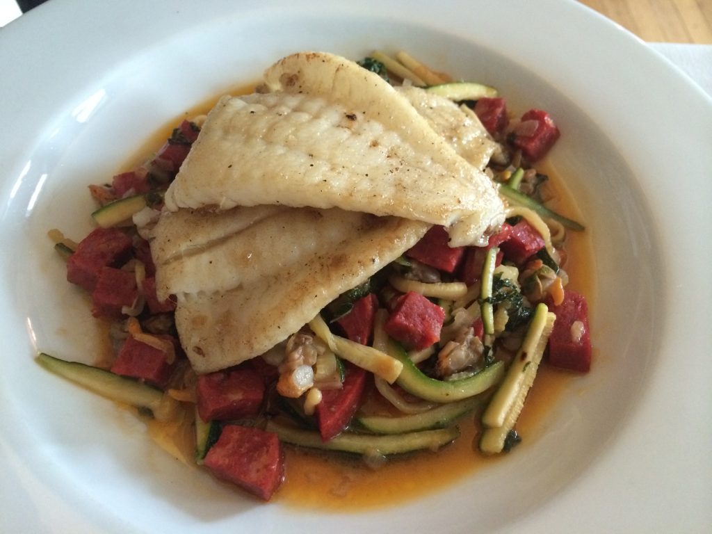 Mains arrived of sea bass and hake, variously accompanied by courgette spaghetti, chorizo, new potatoes and creamed leek & cockles. All cooked to perfection and largely well balanced dishes, I’d perhaps step back on the quantity of chorizo but the flavours were all pleasingly complementary and well matched with the wine.