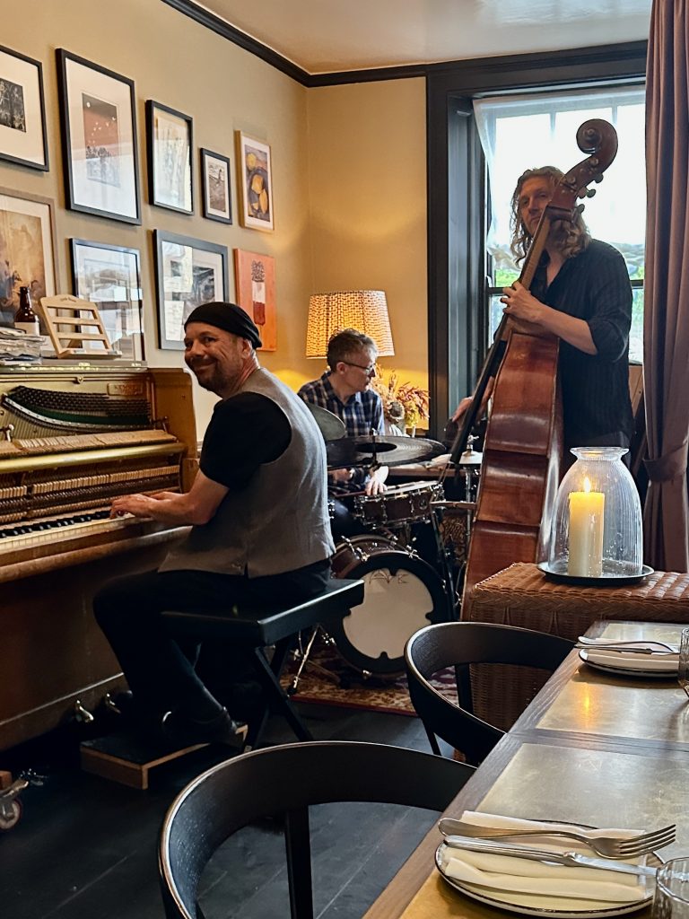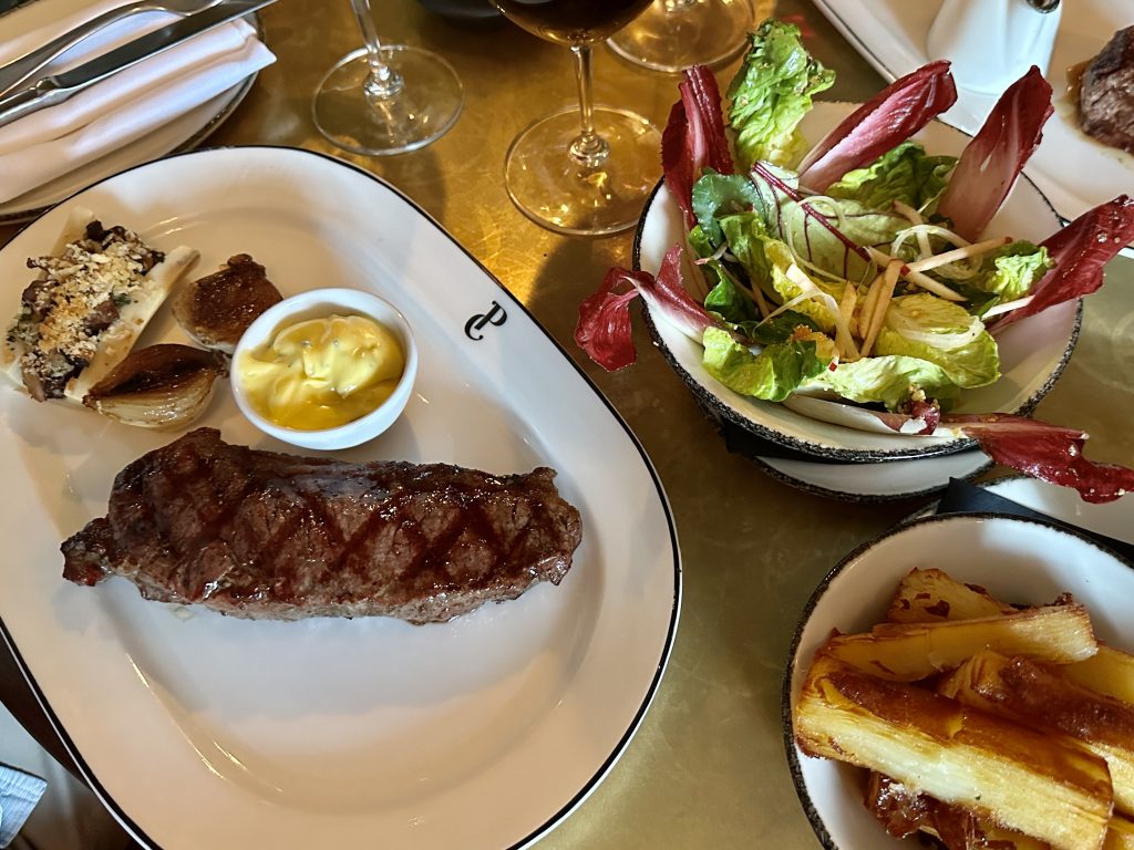 Events are a key part of the offering at The Pearly Cow and once a month they host a steak & jazz night on a Sunday, with a jazz band soundtracking your evening which only costs £85 for 2 steaks, 2 sides, 2 sauces and a bottle of wine – great value in the context of the rising cost of eating out (well everything truth be told). We quickly settled into our seat while the staff made their best efforts to cool the room from the extremely hot day. By nature, the choices needed to order at this type of meal are limited so it was a short conversation to order a fillet and a sirloin to be paired with chicory and blue cheese salad and beef fat layered chips. We chose peppercorn and Béarnaise sauces and a bottle of red wine to prop up those main selections and quickly settled into the familiar sound of the Karl Mullen Jazz Trio, whose frequent appearances at The Phoenix Inn I’m very familiar with.