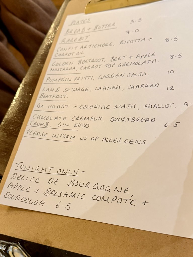 Wet on Micklegate has landed in the space previously home to Notes which took over from Fish & Forest when that moved onto larger premises. It’s an intimate little space that’s fairly minimalist but still feels welcoming and cosy. Service is friendly and personal to such a degree that I never even set eyes on a wine list before a couple of bottles for me to sample have been selected, both white and refreshing as a precursor to a later switch to Beaujolais in honour of the day of our visit being Beaujolais Day!
