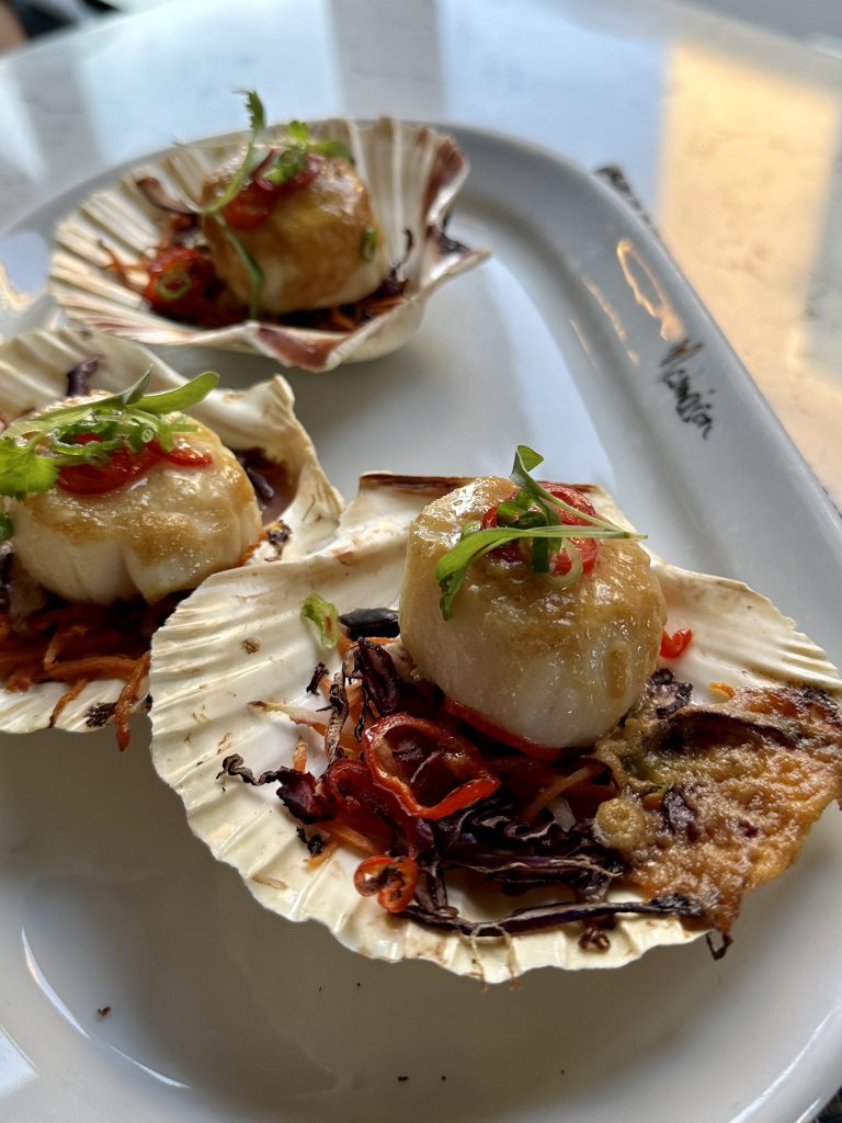With a very drinkable bottle of house (‘maison?) white on the table we were quickly onto our starters which variously featured scallops, beetroot and salmon. Three plump scallops made up one of the dishes and were presented in their shell atop a lightly pickled slaw and a hint of miso and lime butter. Those accoutrements could have been a touch punchier but I’m unlikely to argue too hard in the face of delicious shellfish. Salmon and beetroot is a well trod combination for good reason and this starter was a great example of why. Slightly bitter endive gave a welcome extra element to offset the sharpness of the pickled beetroot and light smokiness of the hot smoked salmon and horseradish cream was also welcome.