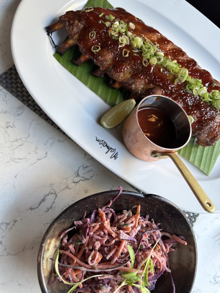 Moving onto mains, first to the table was seared sesame crusted tuna with bok-choi and a chilli, ginger and lime dressing. After getting over an initial hint of shock at the amount of tuna I was enjoying myself and finding all the fresh, light flavours I had hoped for. This was a serious chunk of tuna served fairly rare, fine with me but one to be aware of for those less comfortable with rare meat, though I had no worries as to its cooking. The rack of ribs that graced the other side of the table fulfilled all of the recipient’s desires to get sticky fingered and stuck in, the bones easily slipping out to leave succulent and smoky meat that was given relief by another light slaw. On our server’s advice we had ordered a truffled spinach gratin to pair with the ribs which exhibited a sensible amount of truffle against the earthy spinach.