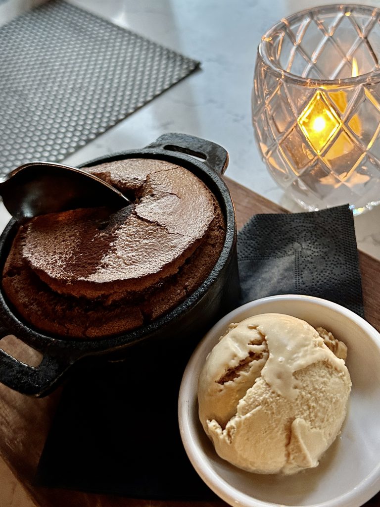 Dessert had to be a shared concern after those hefty portions of tuna and ribs and the 15 minute pause necessitated by selecting the Valrhona chocolate molten pudding gave a further pause in which to recover our composure. When it arrived this was red hot (molten even), gooey, rich and powerful with chocolate for a real sense of indulgence. Salted caramel ice cream on the side lightened things effectively and would be further improved by a bolder punch of salt to further offset the richness of the chocolate.