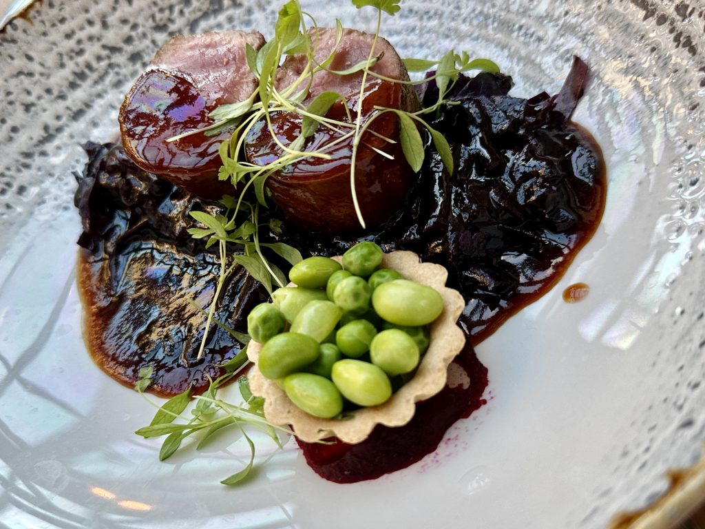 We were quickly onto mains, having our glasses refilled for the occasion, and again impressed with the presentation of the dishes. The corn-fed chicken came in a rich black garlic infused jus with a decent whack of tarragon as well as peas and mushrooms with a micro herb garnish to top it off. All the elements were cooked well and came together for another memorable dish with the sauce lifting the tender chicken nicely as well as tying it to the accompaniments. The lamb dish threw a good deal at the plate with a brace of pieces of roasted lamb loin being joined by a pea and broad bean tart while a mini shepherds pie joined it at the table. Again, the cooking showed a lightness of touch that did the meat justice. The light pastry case and fresh filling gave nice relief from the pleasingly rich nature of the dish, but I wondered if another element to bind the contents would help as well as a slightly thinner shell for a more memorable snap as one bit into it. The shepherds pie was also well executed, with well judged seasoning and a cheesy indulgence to the topping.