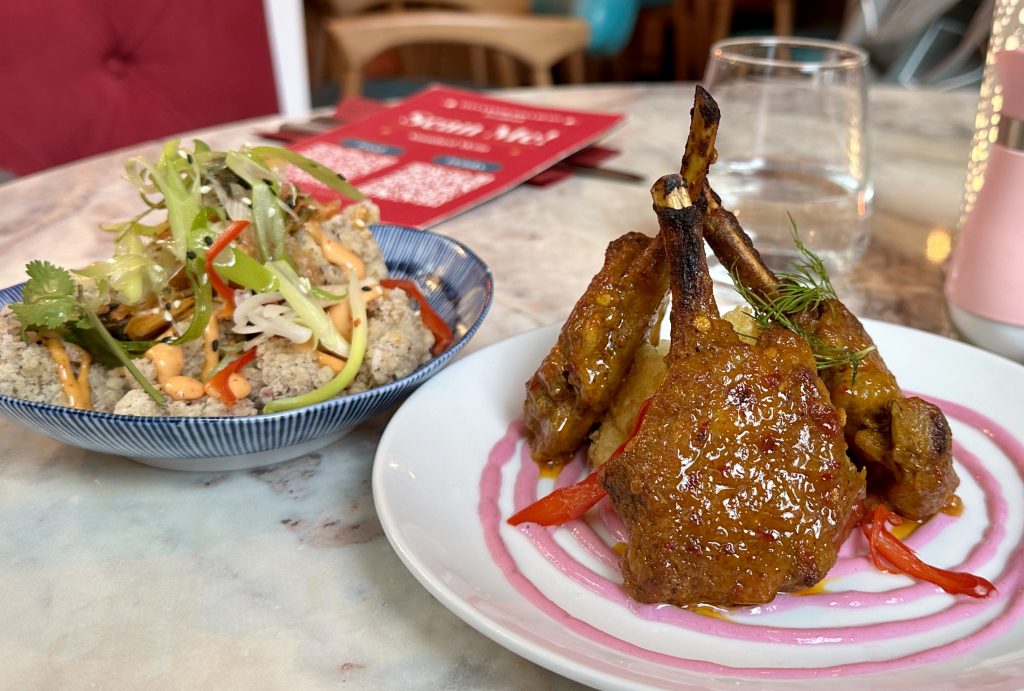 The menu is presented via a QR code on your smart device complete with pics so it’s easy to get a feel for portion sizes and what’s on the plate. We plumped for spiced lamb chops and calamari to kick things off at our table which looked into the interior of The Light, perfect for people watching! There’s a playfulness to the food here; Bobby is clearly unwilling to be hemmed in by convention, and the purple swirl on top of which my lamb chops sat was an amusing embellishment. All the presentation in the world is for nothing though if the food doesn’t taste the part and this is not lost amongst the glitz. Perfectly tender chops and a well seasoned base of crushed potato made a hearty and balanced start that mixed in a hint of spice from a light mango marinade. Calamari was cooked to the point of retaining a pleasant resistance when biting into it without a hint of unwanted chewiness, and it was lifted by a good punch of kimchi.