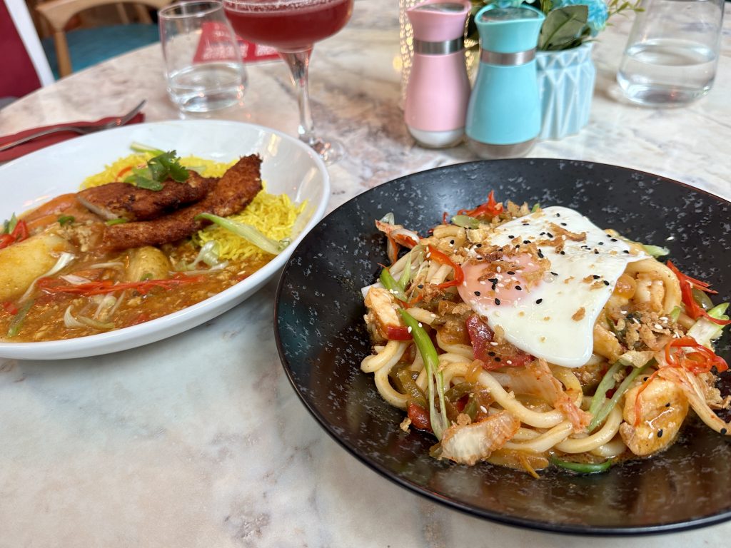 My main of king prawn udon noodles used more of that kimchi which mixed through the thick noodles for a nice kick which was in good proportion with the garlic and pepper elements and generous amount of prawns. I’m a big believer that a fried egg on top of most dishes is an improvement, none more so than here. The Katsu that arrived at the other side of the table used harissa to lift the chicken and seasoned the rice with turmeric for another twist that’s perhaps likely to irritate a few purists but which we enjoyed. The sauce had just the hint of heat you would want or expect from a katsu and this was another vividly presented and generously portioned dish.