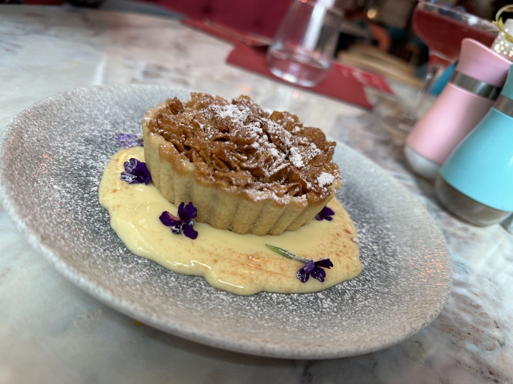 By this point we were pretty stuffed but strong encouragement to try a dessert resulted in a cornflake tart with custard which was spotted with purple edible flowers. The crispy, delicate tart case was rammed with treacly cornflakes and the warm custard made an indulgent and memorable end to the meal.