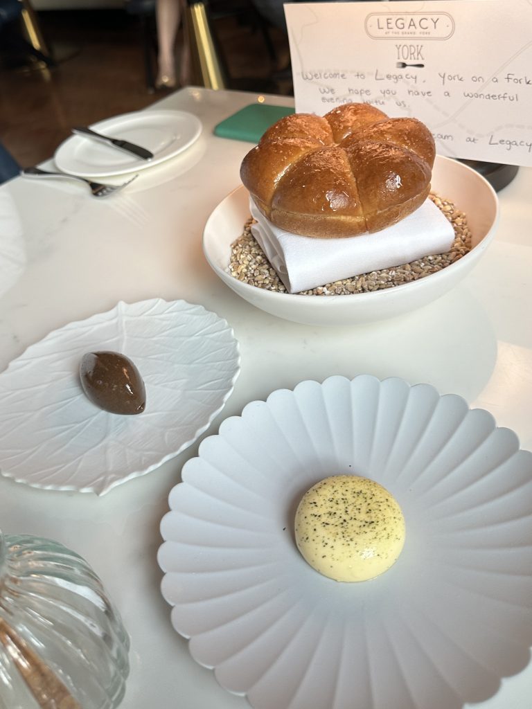 Legacy at The Grand remains just the refined, cool and comfortable space you would expect with plenty of attention to detail in evidence. I particularly appreciated the bespoke printed welcome card on the table complete with York on a Fork logo! There are three variations on the menu which range from £100 to £130 per person, of these we went for “Steel” which is named in honour of the rail industry coming to York and playing a key role in the history of The Grand, which was built as railway offices. This menu plotted a route through many courses of which three required some input from me, while my companion opted for the vegetarian version, making an interesting contrast throughout the evening. As is customary for this style of dining, we kicked off with a trio of snacks presented on bespoke tableware before a soft pillow of bread arrived with flavoured butters that packed in The Grand’s own honey from hives on the roof given a twist by black garlic, as well as a cultured butter dusted with seaweed powder. All this was an effective prologue to the meal alongside a glass of sparkling wine before the first course arrived bringing together bream tartare and jalapeno sorbet with notes of bergamot. This one was packed with clean flavours and neatly presented with some pops of colour from edible flowers to break up the appearance. An intimidatingly large scallop was next across my palate topped with a generous topping of caviar and an earthy backdrop of turnip to bring counterpoint to that sweet scallop.