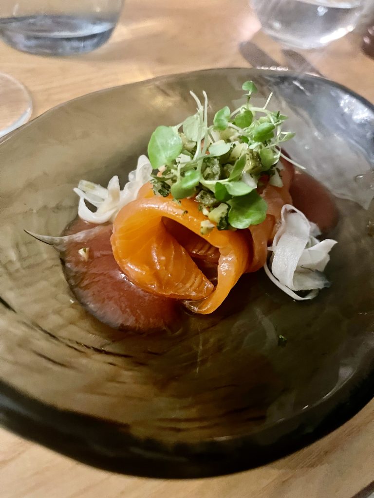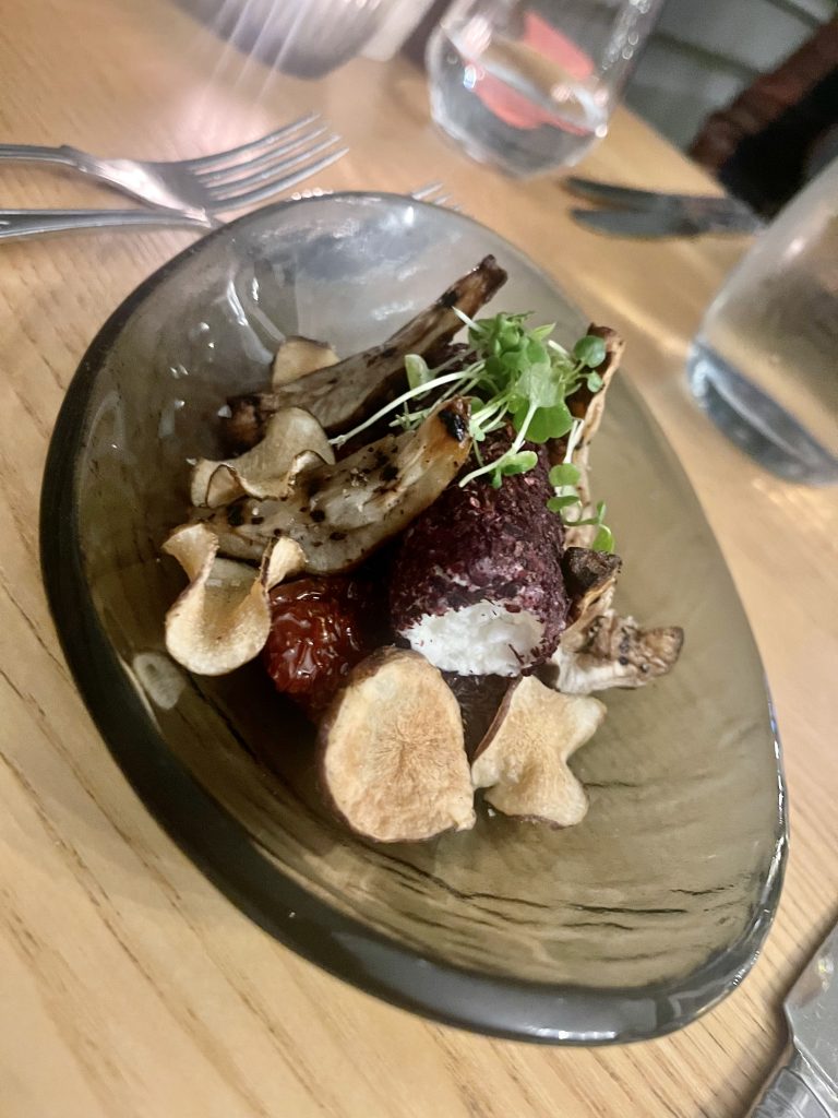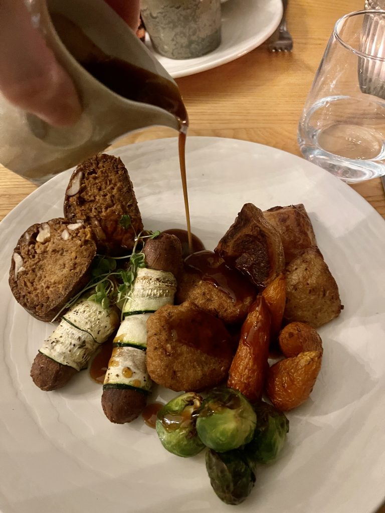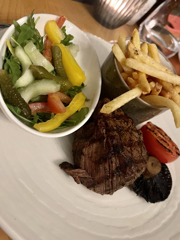 The dining room continues the theme of grandeur tempered by usability, making it a comfortable room in which to relax into a meal. I’d had my eye on the more intriguing options on the specials menu from their website which sadly wasn’t available on the Saturday on which we dined so we instead ate from the regular menu, from which we chose salmon and goats curd starters followed by a steak and a nut roast. Starters arrived quickly along with glasses of wine to accompany, the goats curd had a good dose of artichoke presented a couple of different ways while the salmon had a nice touch of heat from a chilled Bloody Mary dressing. Fillet steak had a decent char on the surface and hadn’t been taken beyond rare as I’d requested, coming along with a side salad and fries while the nut roast from the Christmas menu came with a nice rich gravy, and we finished with a portion of cheesecake to share.