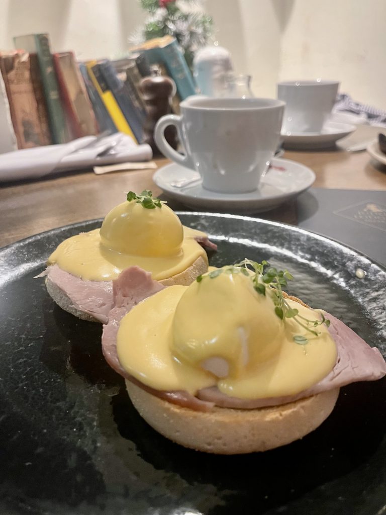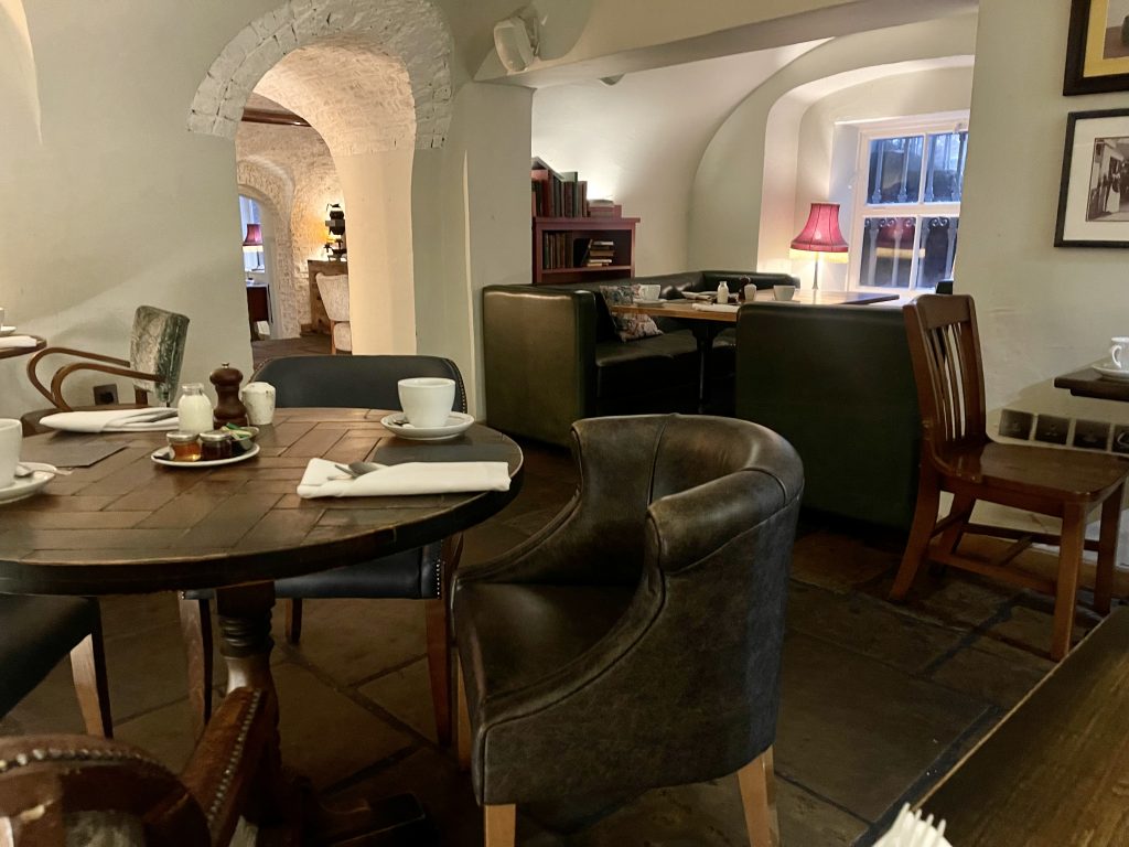 It’s rather unusual to spend the night in a hotel in one’s own city so we took the opportunity after dinner for a stroll around the Christmas lights before settling back into the comfortable room for a good nights rest before one of the key pillars of of a decent hotel stay, breakfast. The morning meal was served down in the cellar bar, which had been spotlessly cleaned and showed precious little trace of the preceding evening’s revelries and was set more formally for a breakfast service. Eggs Benedict were well executed with a brace of well-judged poached eggs enrobed in a glossy, rich Hollandaise while a full breakfast was just the indulgence you would want, leaving you without further appetite for a good many hours.
