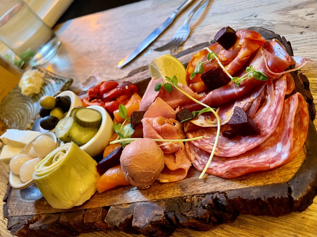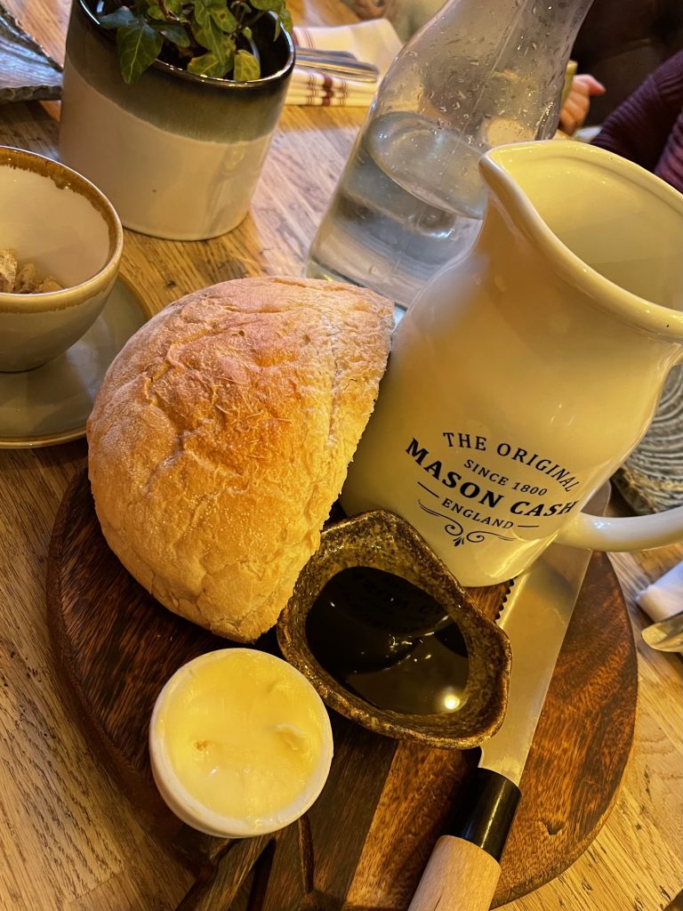 Galtres Lodge has been transformed over the last few years after a change in ownership and is firmly embedded as one of the best places to stay in the city, while its restaurant Forest certainly isn’t an afterthought and has its own sense identity. I’ve eaten there a few times and always enjoyed the balance struck between fun and formality so the idea of their new Galtres Lodge Sunday Feast tickled my fancy, looking like a quite significant amount of food for £35 per person. This multi-stage meal packs in a soup course and a grazing platter as precursor to the main dish before throwing dessert at you too, with cheese an optional extra if you have the appetite. Bread and soup are the first things to be presented to the table with the celeriac soup coming in a jug from which to pour over blue cheese and onion chutney in individual cups that dictated a sensible portion size to start us off. Pushing tableware into service for which it’s not originally intended can be a minefield but I enjoyed the quirky presentation on the basis that it actually supported the utility of the dish, which was delicious and enhanced by the texture and spikiness of the blue cheese. Bread from Bluebird Bakery is always a benefit to a meal and was perfect to mop up the soup.