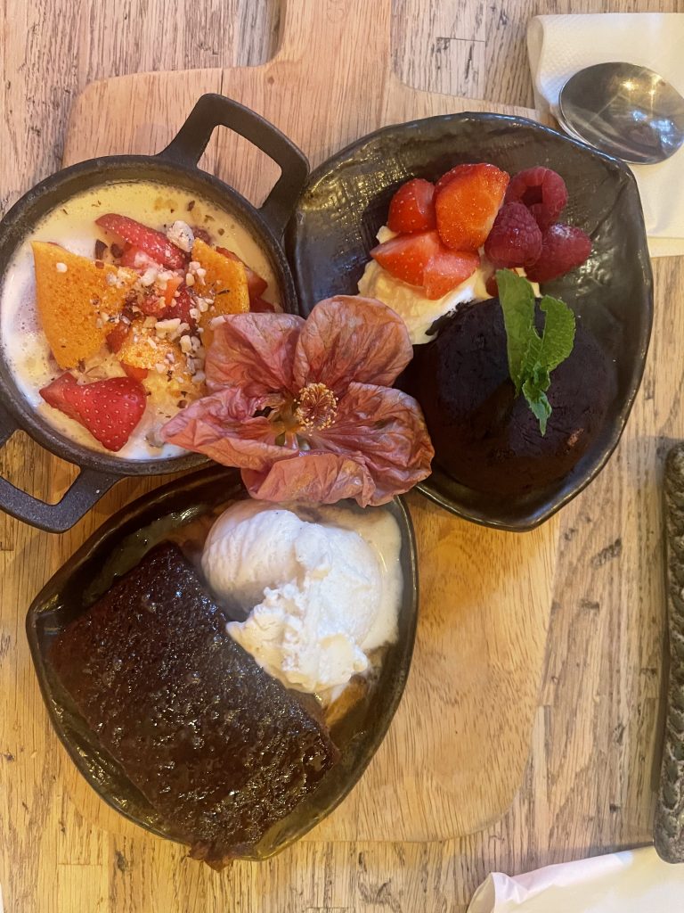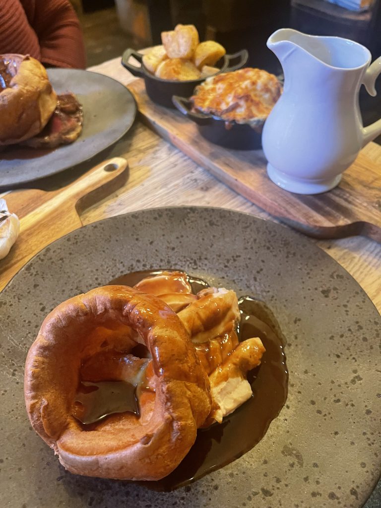 All of this would be in vain if the main element didn’t live up to expectations but the arrival of generously dressed plates of meat and Yorkshire Puddings augured well, with the arrival of platters containing side dishes next to challenge the table’s dimensions. We enjoyed chicken and beef which had been taken to their full potential by skilled cooking then draped in gravy and topped with a hearty Yorkshire pud, sides of roast potatoes, cauliflower cheese, heritage carrots and buttered greens all present and correct too. A generous jug of extra gravy provided even more comfort as we tucked in to the course that amply justified the “Feast” title. Before we left, we also enjoyed a selection of desserts: a posset, sticky toffee pudding and a dark chocolate fondant all vying for our affections from which the sticky toffee took most praise from me, though I particularly enjoyed the bitter dark chocolate too.