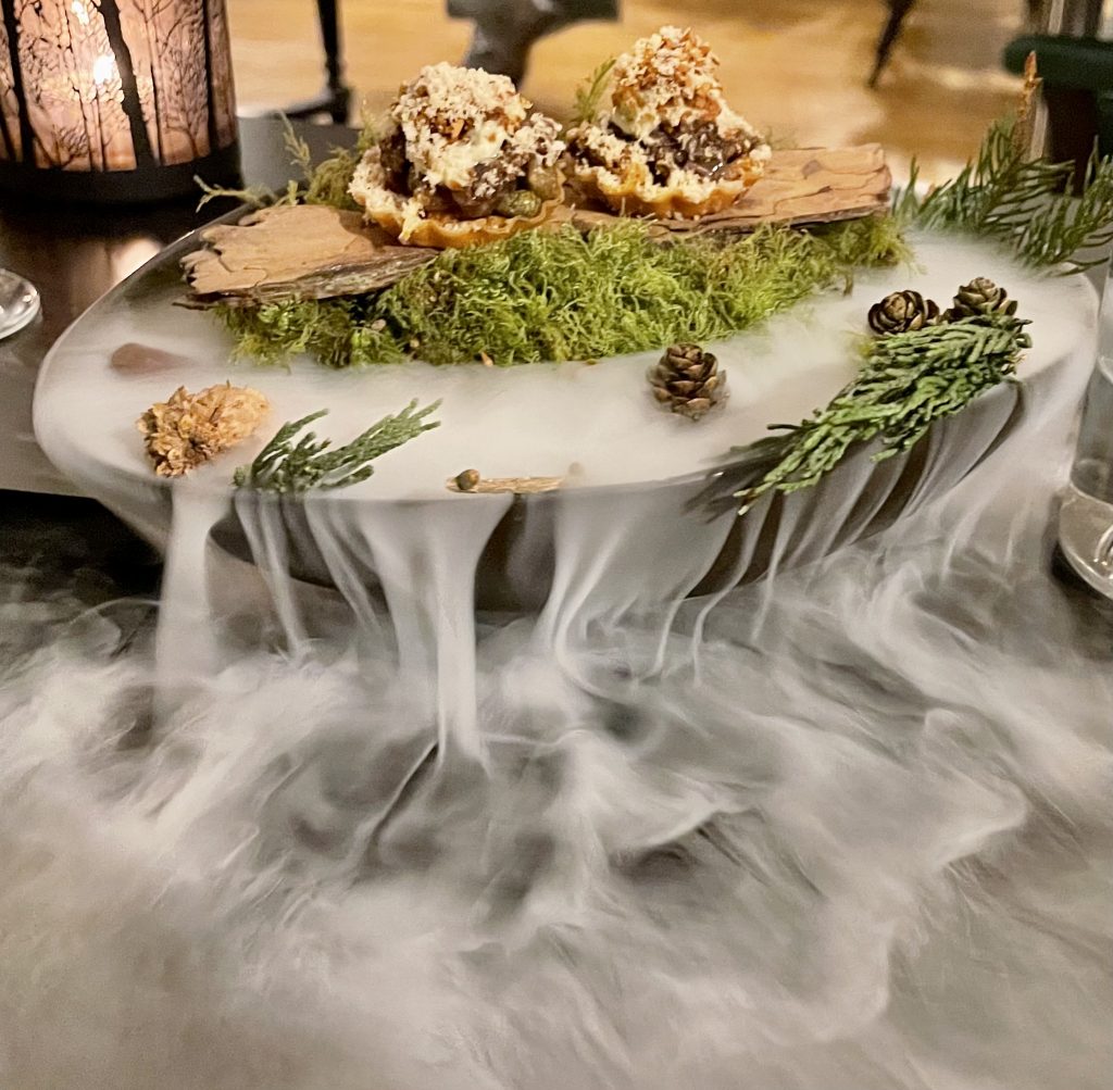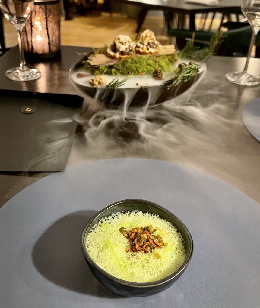 Arriving at Grays Court is an event in itself as you duck along some of York’s quieter streets to find a courtyard festooned with fairy lights across an avenue of trees before descending a couple of steps to be welcomed into the building. From there it’s up to a gallery style bar area in which to enjoy a pre-dinner drink and amuse-bouche. This is one of those spaces that seems automatically to imbue one with a sense of calm as things slow down and you’ve time to take in your surroundings, enhanced in this case by a glass of sparkling wine and a charmingly light Lincolnshire poacher and truffle gougère to start things off. After polishing those off at a leisurely pace we were on our way through to our table in the dining room complete with personalised menu. Before the menu kicked off in earnest we were to enjoy a couple of snacks and a bread course that set the tone for the evening quite perfectly, with a venison tartare tart emboldened by capers and hazelnuts accompanying a venison ragout served under a celery foam also spiked with capers. This coupling was served across a striking bowl of foliage that, when arriving at the table, used dry ice to snake tendrils of spruce scent around us as we confirmed the balance of the snacks was as well resolved as the sense of occasion. Wild garlic is bang on season at the moment so not wholly unexpected cropping up to enhance a white onion butter that was served with a tiger bread, another exercise in restraint as neither garlic nor onion flavour dominated while both were present in quantity.
