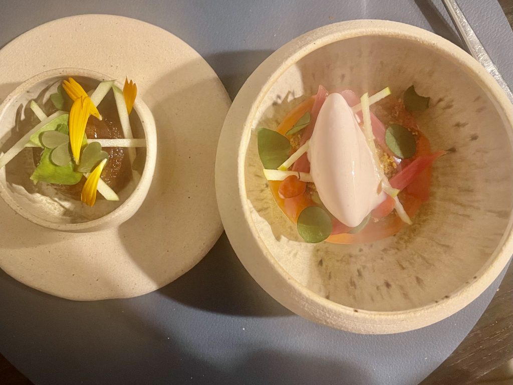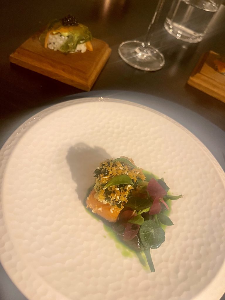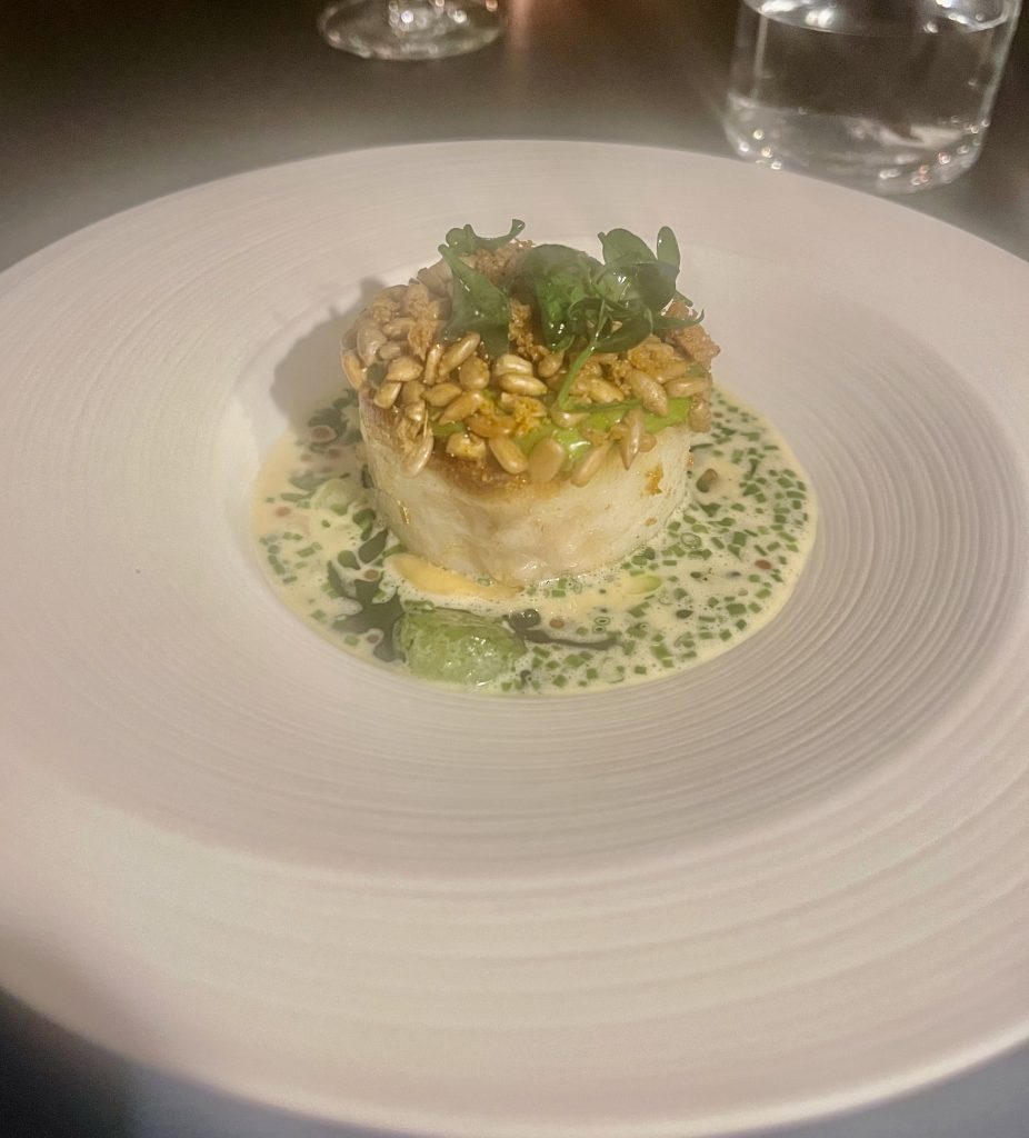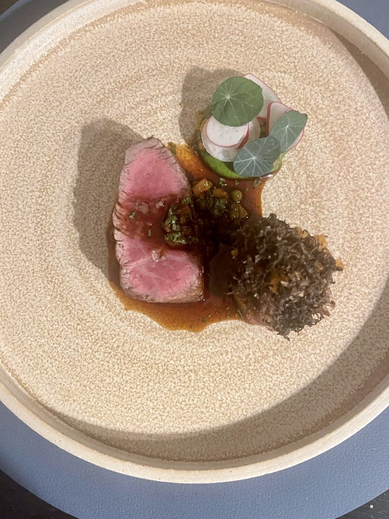 Having enjoyed that preamble, we started on the menu itself with a first course of cod, cucumber and a fennel element along with a champagne sauce, all of which harmonise beautifully to continue the sense of balance, before our next fish course of Sea Trout. This one was served with a beetroot and wasabi as well as a partnering piece of sushi giving a greater sense of scale. I’ve always admired Adam’s delicacy of touch with heat and the wasabi cutting through the rich fish was judged to perfection here, all underpinned by hard working beetroot and a scattering of nasturtium for presentation and a little extra pep.