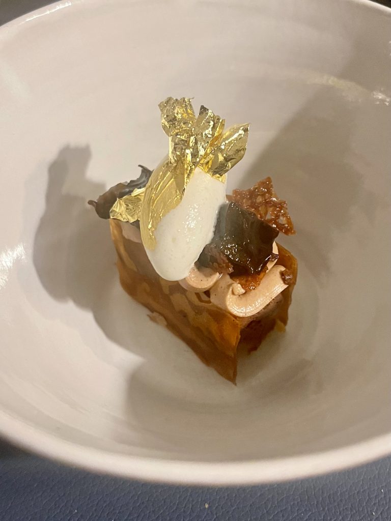 At this point we were feeling the impact of all this indulgence before embarking on desserts but a good hit of sugar from the first sweet course quickly kickstarted our digestion and had us back on track. This was another dish of two parts with an apple cake in the lid of the serving vessel giving way to ginger and rhubarb in the bowl. Our last course balanced bitter dark chocolate with armagnac and prune sandwiched between two sugary crisp sheets with a flourish of edible gold for good measure. The wines that went along with each dish were a an original selection featuring an orange wine, a Georgian wine and a particularly well matched Hungarian Tokaji to bring out the best of the ginger, apple and rhubarb course.