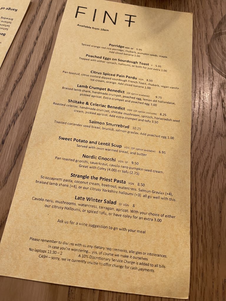 Fint is the new incarnation of Fettle which, prior to the rupture of 2020, was making its name as a relaxed venue to enjoy Scandi-influenced dishes and all set for a refresh to take it to the next level. Skipping forward over the aforementioned interruption to our lives and Fint is absolutely buzzing when I arrive around midday on a Sunday to get stuck into their brunch dishes. The small dining space is beautifully appointed with wood from a local craftsperson and squeezes in enough of a crowd for an atmosphere without getting greedy enough to impair your passage through it. The Fint Leeds brunch menu handles the transition between brunch and lunch neatly with a reasonably equitably division between more traditional brunch dishes and more typical lunch dishes.