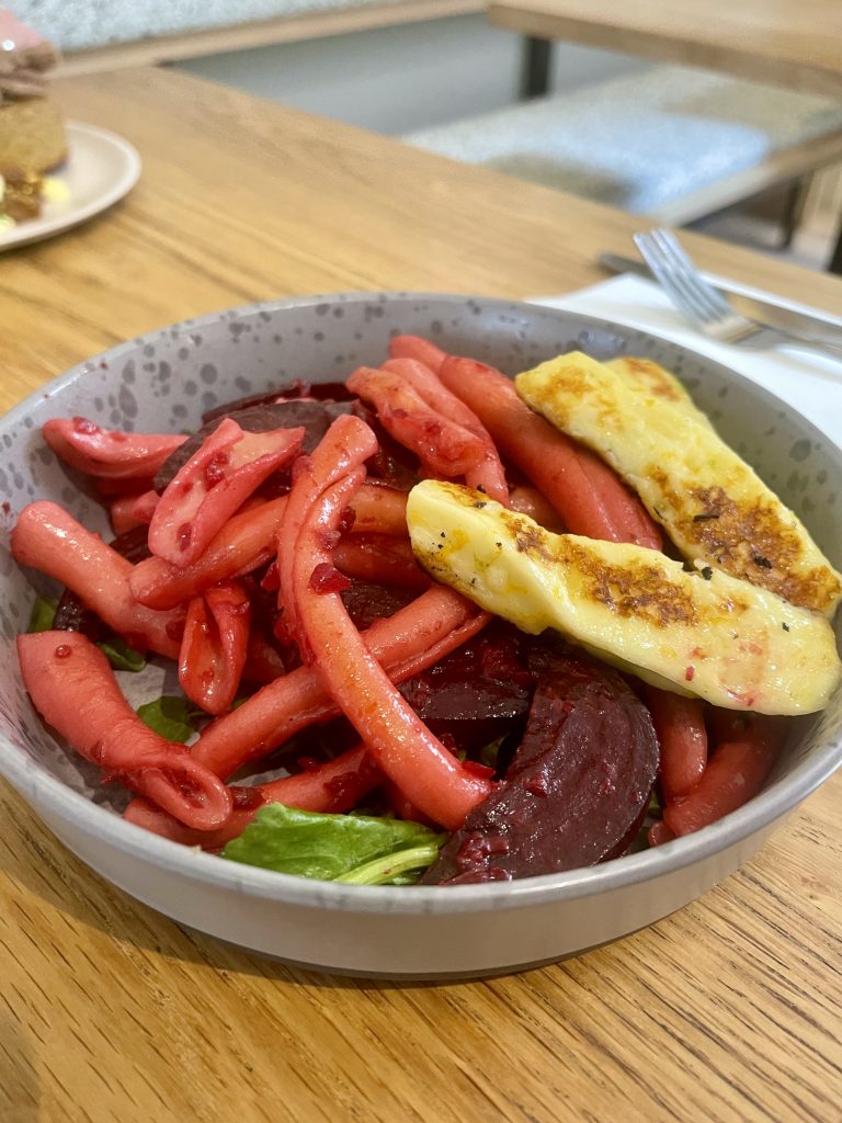 Strangle the Priest (Strozzapreti) pasta can trace its name back to various, presumably apocryphal to varying degrees, stories that all seem to have roots in the resentment of the clergy many years ago in various regions of Italy. Regardless of etymology though these are elongate, twisted ribbons of pasta that hold a sauce well and were a vivid shade of pink in that dish that served them with beetroot, watercress and coconut cream with options to augment including salmon, lamb or halloumi. I took up the latter option after asking my server which they would opt for and was more than happy with the resulting vibrant and satisfying dish including a generous amount of the headlining halloumi and beetroot.