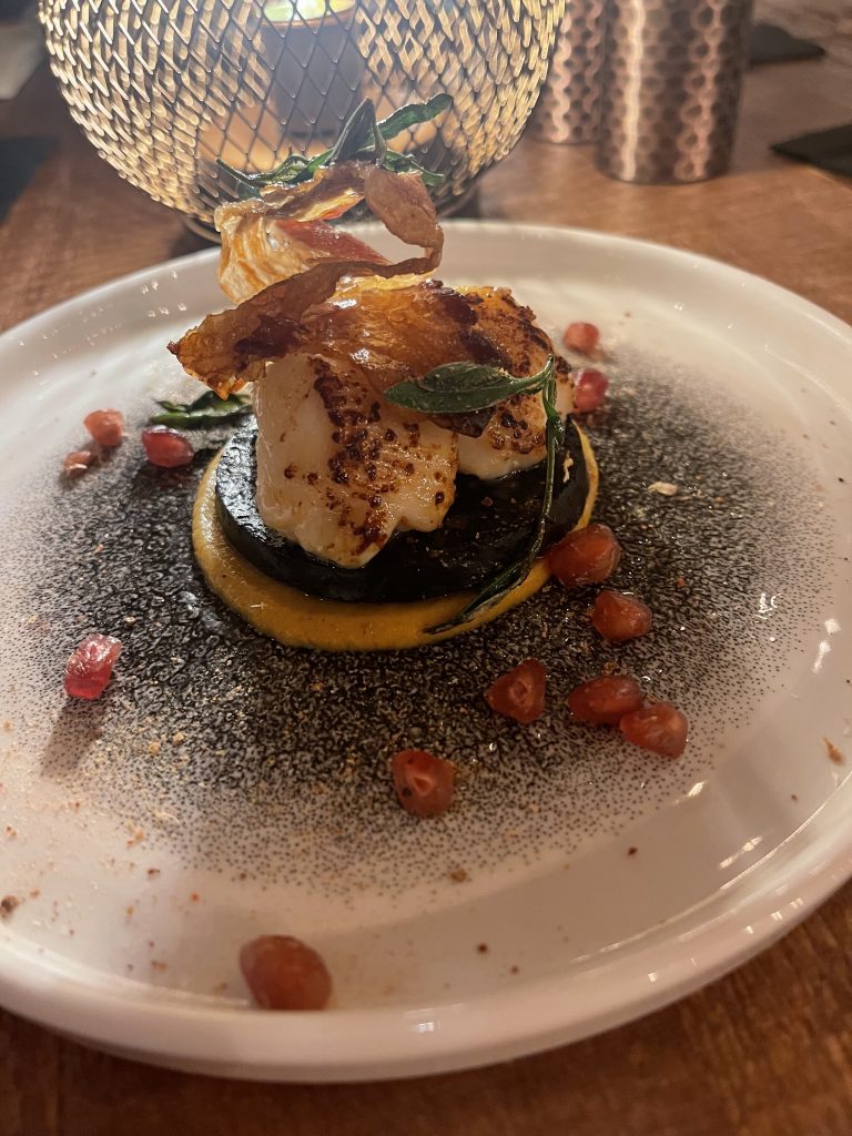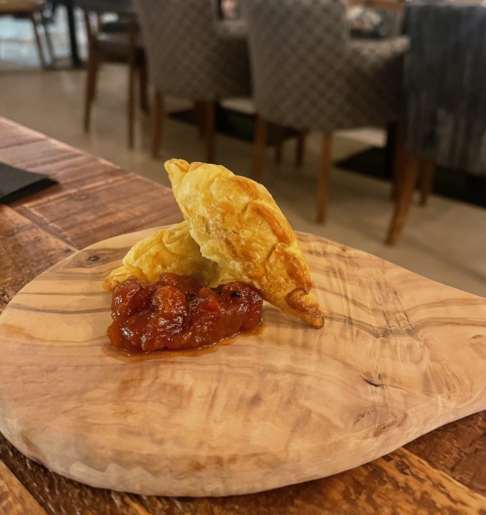 We were quickly settled at our table and beginning the menu forensics with drinks in hand, grabbing some “Gunpowder potato puffs” to take the edge off while we took stock of our options. These mouthful sized samosas that were packed with spiced potato did their job of piquing our interest without denting our appetites and it didn’t take long to settle on a quartet of starters and mains. The successful candidates in this case were scallop and black pudding and cheddar and leek tart starters followed by mains featuring lamb and chicken.