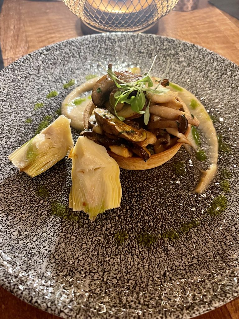 Scallops were first to interrupt our conversation by dint of a presentation perching them on top of a thin disc of black pudding, itself embedded in a circle of mildly curried parsnip with pomegranate and sea herbs for embellishment. Scallops are an easy thing with which to impress which can be tricky to augment without overwhelming, but the hint of curry along with the rich black pudding pulled things into a very pleasing dish served on striking tableware. The cheddar and leek tart used artichoke both whole and as a puree to further itself as well as a scattering of wild mushrooms, which would be nothing without the tart filling being up to scratch. Thankfully the leek and cheese filling hit its mark as accurately as the accoutrements and the pastry was as delicate as one would hope to complete an accomplished couple of starters from Bosun’s restaurant Head Chef Craig Hillery.