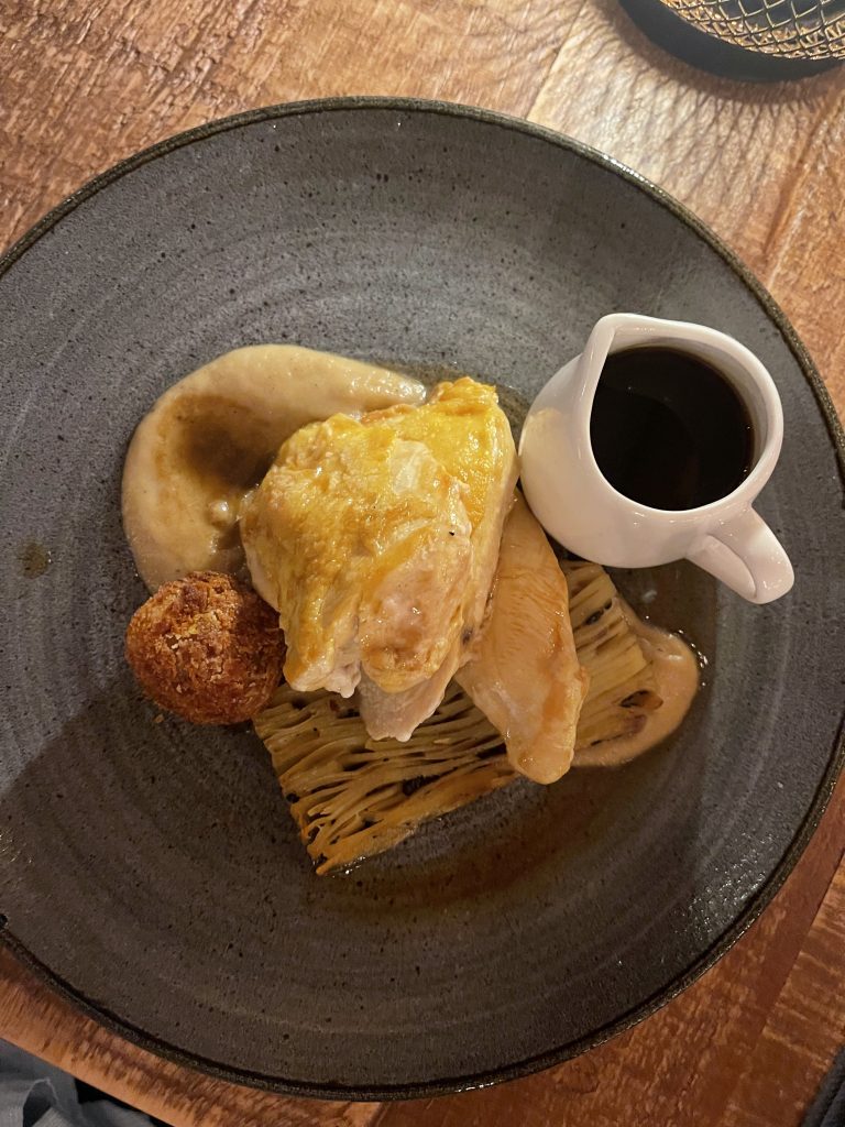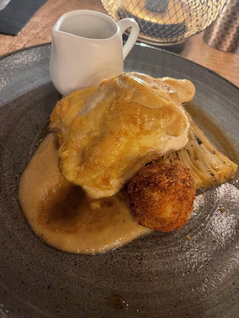 Lamb rump rewards careful cooking and the execution on this one certainly made it feel like a prize, being uniformly pink and tender with the fat rendered nicely to make a suitable centrepiece for the plate. Fondant potato is another easy thing to trip over – I’ve had a few crunchy ones over the years – but this one yielded happily all the way through to offer a further sense of luxury. Fresh peas and a scattering of pomegranate finished the plate nicely, tempering the richness of the lamb and buttery potato well. Chicken breast is another minefield through which I seldom wander in restaurants but the accompanying truffle Pommes Anna and onion puree persuaded me toward it, along with a potentially fantastic chicken leg bonbon. With a rich jus to tie things together this was another plate of complementing textures and flavours that demanded one’s full attention. Pommes Anna is as prone to overcooking as chicken breast but both sidestepped any issues, with a good shot of truffle livening up the potato which had a nice bite at its extremities and was soft in the centre. Onion puree is a much underused thing that more than earned its place on the plate too and the bon-bon added a welcome further dimension.
