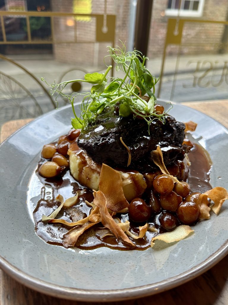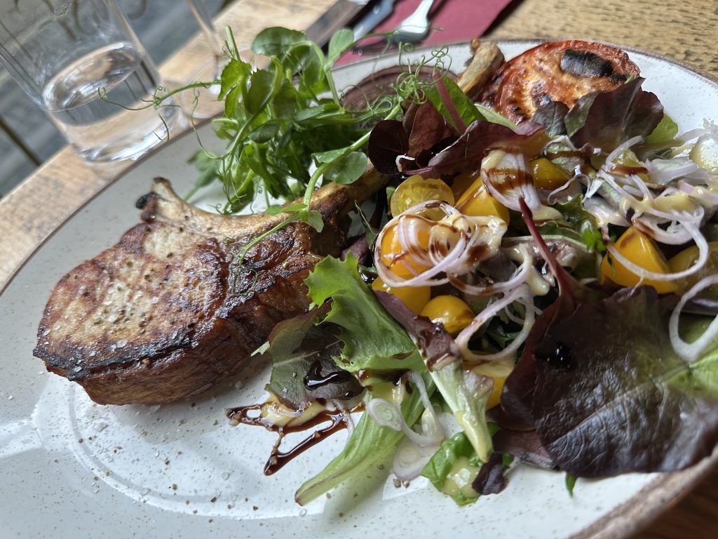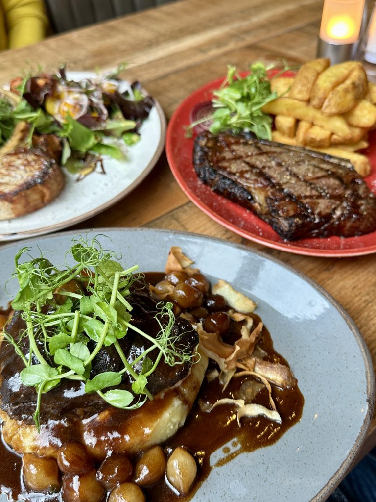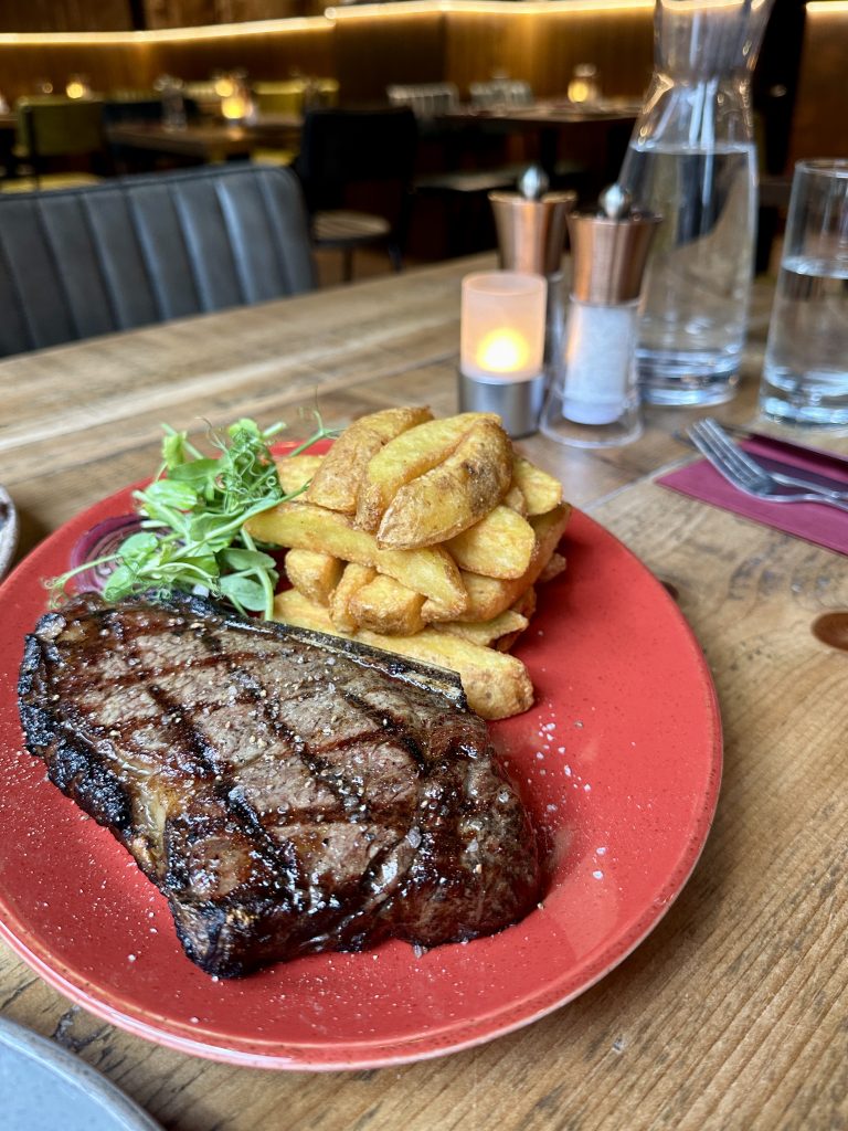 The theme of over-ordering continued with main dishes as I wilted under Radek’s suggestions to try three things and we agreed on ox cheek, pork tomahawk and sirloin steak. We opted for chips to accompany the steak and a salad to go with the pork, though of course they were distributed between the plates at our whim anyway. Ox cheek was accompanied by creamy mash and a generous quantity of small onions with some parsnip crisps for texture and pea shoots to temper this rich dish. Ox cheek really rewards a long, slow cook and the preposterously soft and unctuous texture this example delivered was outstanding. Butter-rich mash brought more luxury and sharp pops from the pearls of onion punctuated the richness neatly. I’m a competent home cook and know how to do justice to a decent cut of meat, something which can be mysteriously lacking in some restaurants. The evidence here puts Corner Grill House firmly on my trusted list with the sirloin cooked perfectly and obviously from a quality supplier. Pork matched up well with a rewarding depth of flavour and tender consistency that stood up for itself against the quality of the steak well. A bold Malbec from the well-appointed wine list was perfect to accompany all this