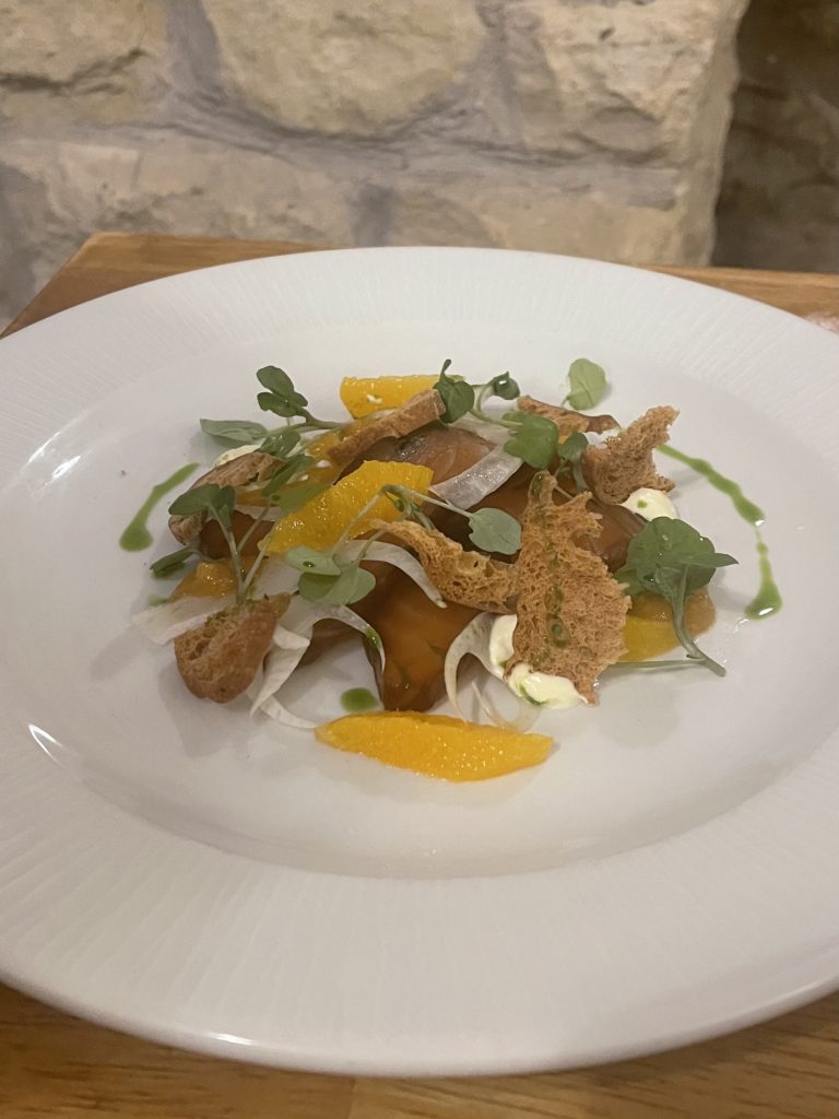 A well kept and quickly delivered pint of Black Sheep was emblematic of well judged, friendly service as well as a precursor to a neatly presented first course. A classic prawn and crayfish cocktail is a dish that can easily become insipid, needing a good punch mixing into the sauce that holds things together. This was present in abundance though, the sauce underpinning the generous amount of seafood here. A few pickles and sun-dried tomatoes (why have these fallen out of fashion so much?) rounded this one off while treacle cured salmon took centre stage on the other plate. Shards of brioche crouton crunched nicely while orange, creme fraiche and fennel gave the dish a sense of breadth.
