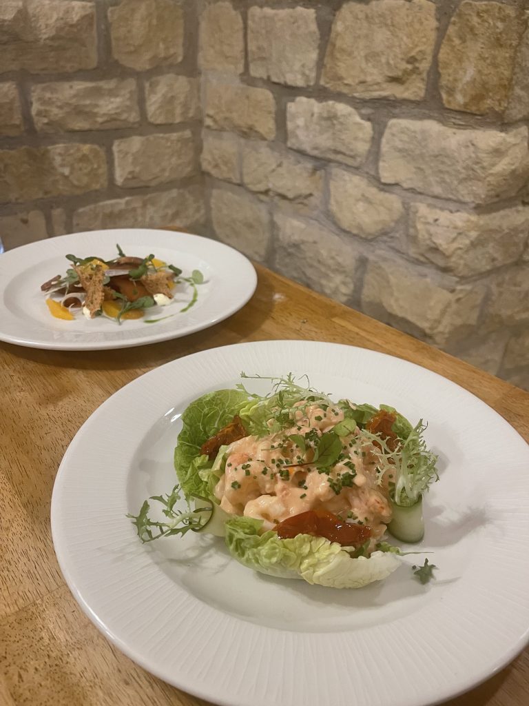 Entering The Crown and Cushion Welburn gives all the right signals, with a friendly server establishing we were dining and directing us through the bar to our table. The bar area was quiet on our lunchtime visit but was well set to welcome casual drinkers as the day went on and the dining room was a relaxing spot into which enjoyable food could be served. The menu featured a few dishes familiar to me from our recent visit to The Punch Bowl at Marton Cum Grafton (also part of Provenance Inns) as well some unique to this venue, so it didn’t take long to whittle it down to a few promising sounding dishes. I’d had my eye on the parmesan and asparagus tart but with that out of service for the day we ended up plumping for smoked salmon and prawn cocktail dishes to start.