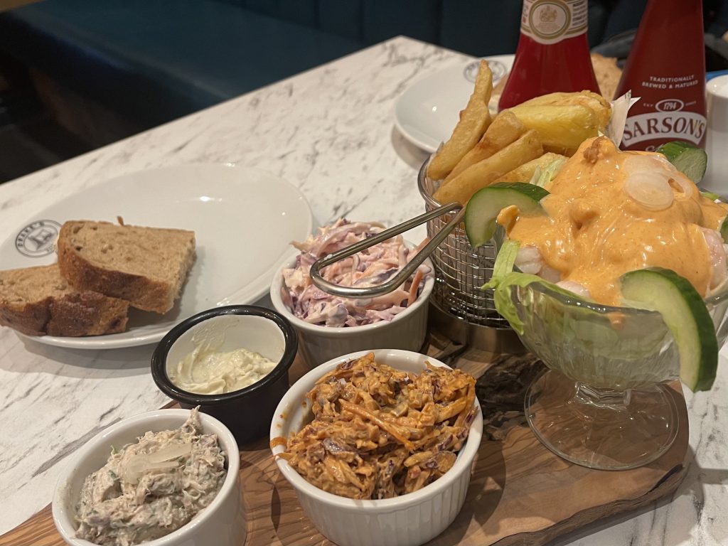 The sharing platter we ordered turned out to be a pretty significant challenge, with large portions of the menu represented across it. Truth be told, we could have coped just fine without the extra child portion with the amount of food. When our food arrived, we found beef dripping cooked chips, portions of different coleslaws and a few different sauces to be excellent scene-setters for some superbly executed fish dishes. Battered fish was an obvious starting point with crisp batter and flaking fish both present and correct while scampi were obviously whole bits of meat rather than the sadly reformed efforts often occupying freezer aisles. Calamari is another potential stumbling block, deftly handled here and left as soft as one would hope. Mackerel pâté and prawn cocktail finished off the selection with a flourish, the prawn cocktail enjoying retro presentation and the pâté with brown bread making the most of the strong fish.