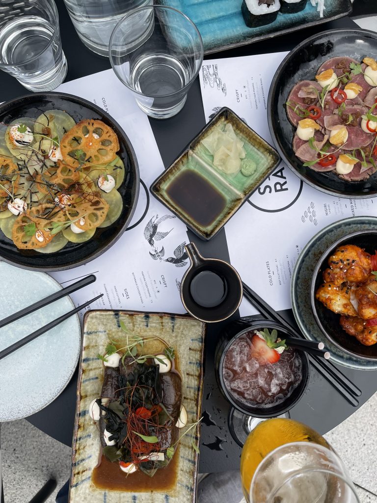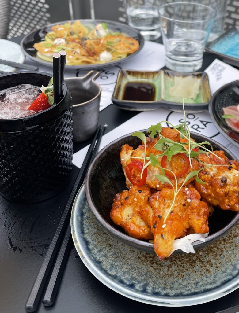 The food menu consists of sushi and small plates with a pan-Asian theme, of which we were directed to order two or three each as a guide, as well as a upmarket range of cocktails and spirits. With the full range of sushi unavailable on our visit we ended up grabbing a few bites of sushi and leaning more heavily into the hot dishes than I had anticipated, which turned out very well! A couple of bites of Salmon Sashimi went down well along with a plate of Tuna Maki but the other plates shone brightly enough to make up for the the cloudy day we’d chosen in the midst of a heatwave. Beetroot carpaccio with lotus root crisps was a fresh and colourful plate with well judged pickling and a scattering of saffron which contrasted nicely with slices of tender beef tataki brought to life by finely sliced crisps of garlic and pickled mooli. Aubergine with miso caramel and whipped tofu was deceptively light with a delightfully well judged sweetness and our final dish of Korean Fried Cauliflower was another hit. There was a good undercurrent of heat through these and more good judgement in the cooking, leaving them firm enough to easily navigate but soft enough to enjoy easily.