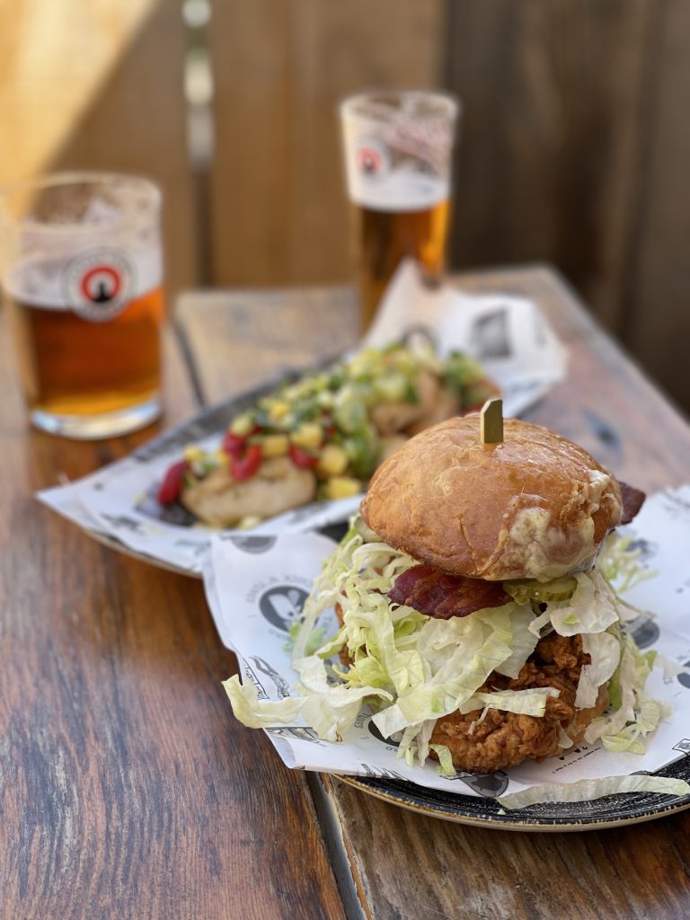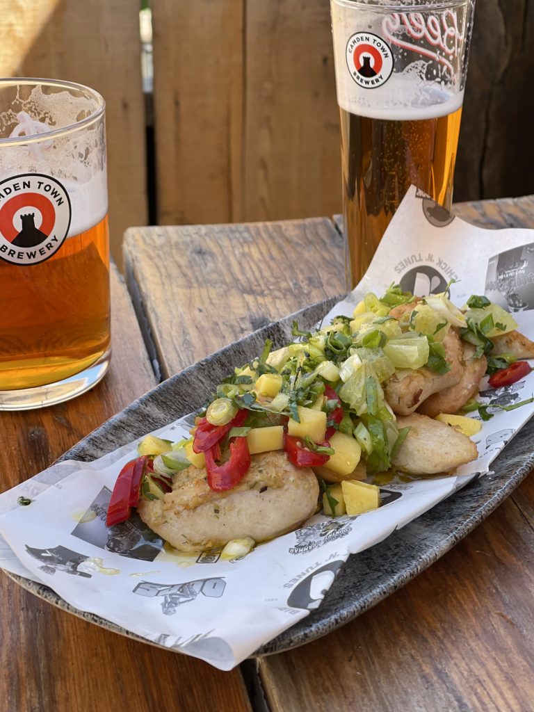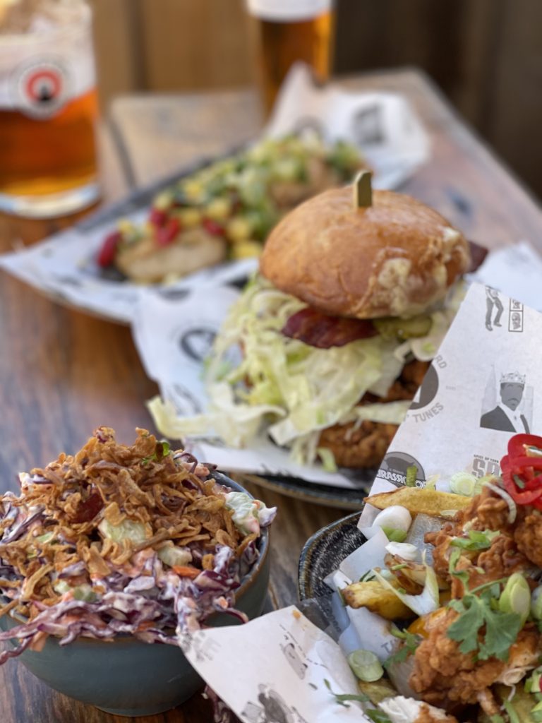 It didn’t take long for a pretty serious amount of food to arrive on the table and only a short time more to establish that it was really very good indeed. The burger immediately made its point with a faintly improbable amount of fried chicken crammed into it along with bacon, cheese, bbq sauce and a healthy dollop of bacon jam that all sang together in a flavour-packed chorus. The “Cop Porn Chicken” loaded fries carried the weight of an equally significant amount of fried chicken and were mixed through with chilli, onions and peppers that made it feel like a well optimised version of the kind of salt and pepper fries that are a staple of late night Chinese takeaway orders. Resting beach face was straightforward pieces of chicken breast that had been baptised with a mango salsa that was rammed with coriander along with plenty of lime, making for a strong smack of refreshment perfectly matched to the day’s intense sun.