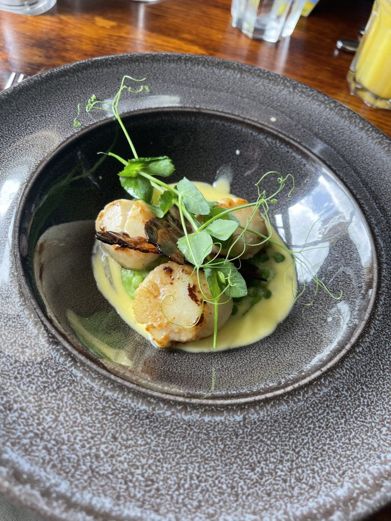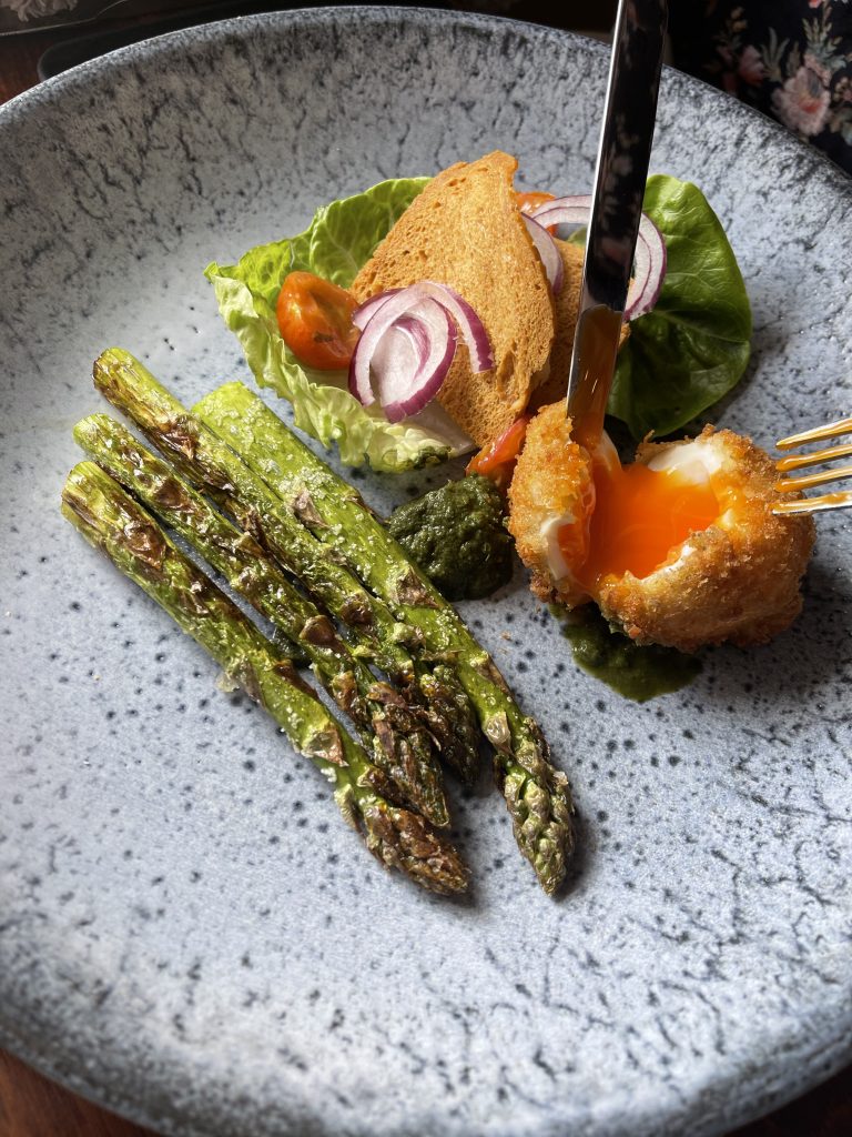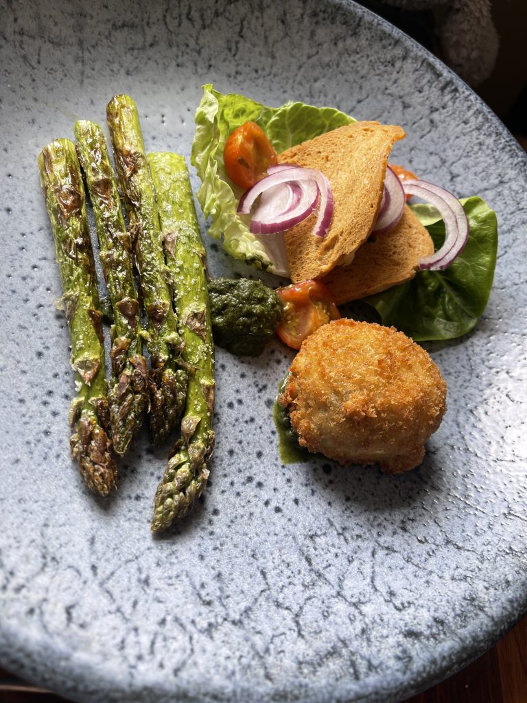Scallops are something I feel haven’t been numerous enough in my life throughout lockdown so they were a no brainer amongst the starters along with an asparagus based special whose price included a donation to a charity specialising in supporting the deafblind and those with complex disabilities. With a portion of fish and chips duly ordered by the youngest person at the table, we were all set and before long tucking into our first courses. Scallops with pancetta and pea is deservedly a classic that doesn’t need mucking about with, the combination of generous size scallops with pea puree and pancetta was always going to be a winner and a touch of sorrel as an emulsion gave enough of a twist to make it distinctive without going too far. The asparagus dish hinged upon getting the crispy hen’s egg right and thankfully upon its bisection a soft yolk was revealed to go alongside the local asparagus. A side salad, crisp breads and a tarragon dip completed things while on the other side of the table, fish and chips were starting to disappear at a rate suggesting the recipient’s approval.