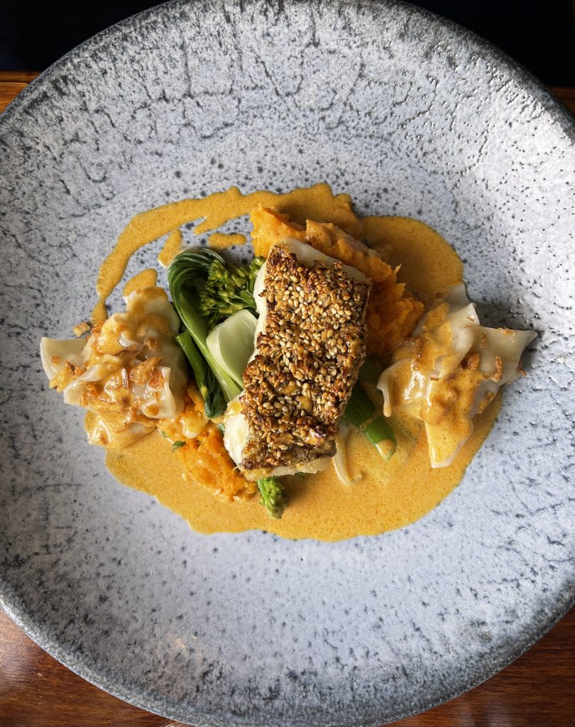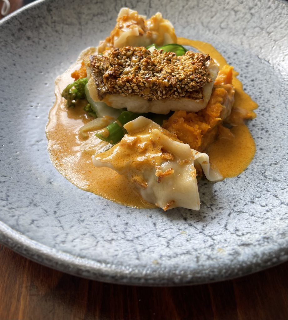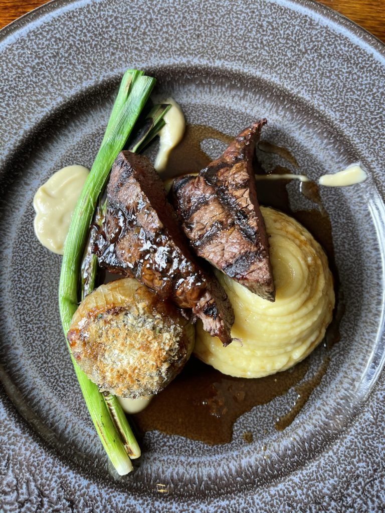 Next up came hake with a Thai twist courtesy of a sesame crust, prawn dumpling and a Thai coconut sauce which all came together nicely with a hint of originality and plenty of comforting flavours that showed a lightness of touch with spicing. The final dish we chose was headlined with a real star ingredient, Warrendale Wagyu Beef marking this one out as holding plenty of potential to be fulfilled. The beef rump took a confident first step to the plate living up to that potential, showing evidence of everything a quality piece of meat deserves such as seasoning, resting and being allowed to remain pink. Slowly cooked beef shin also filled a hollowed out roscoff onion with a big punch of flavour, making this a notably indulgent dish. Alongside these were a generous amount of pomme puree that was appropriately rich and a beer based sauce. Charred baby leeks and white onion puree gave a bit of sharpness to contrast and finish off this memorable dish.