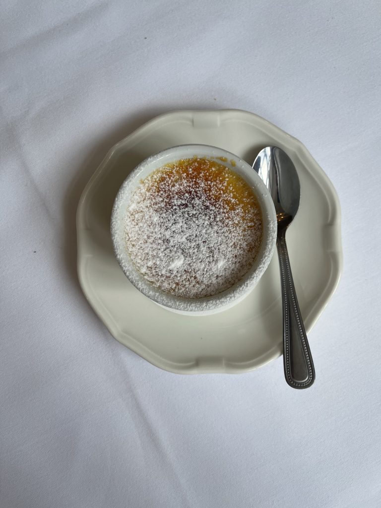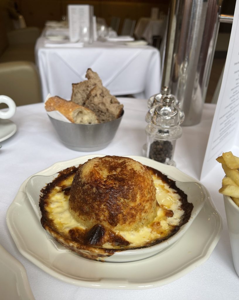 For sides we grabbed bread (from the estimable Little Arras), greens, fries and a salad that all showed a lightness of touch which allowed them to reach their potential, but the real star was the main that had been recommended by the restaurant manager as something of a ’21 signature – cheddar and spinach soufflé. This pleasingly burnished dome arrived on a screamingly hot plate in a sea of cheesy sauce looking like a pretty serious piece of work, an impression only reinforced as it happily parted for a fork to reveal itself as a fitting headliner, beautifully light but rammed with plenty of flavour. Chiselling the burnt bits of cheese from the screamingly hot bowl was a guilty joy, probably making a victim of the tablecloth, so I’ll definitely be back for more of this while leaving a suitable tip for the poor pot-washer left to clean off the remaining burnt on cheese.