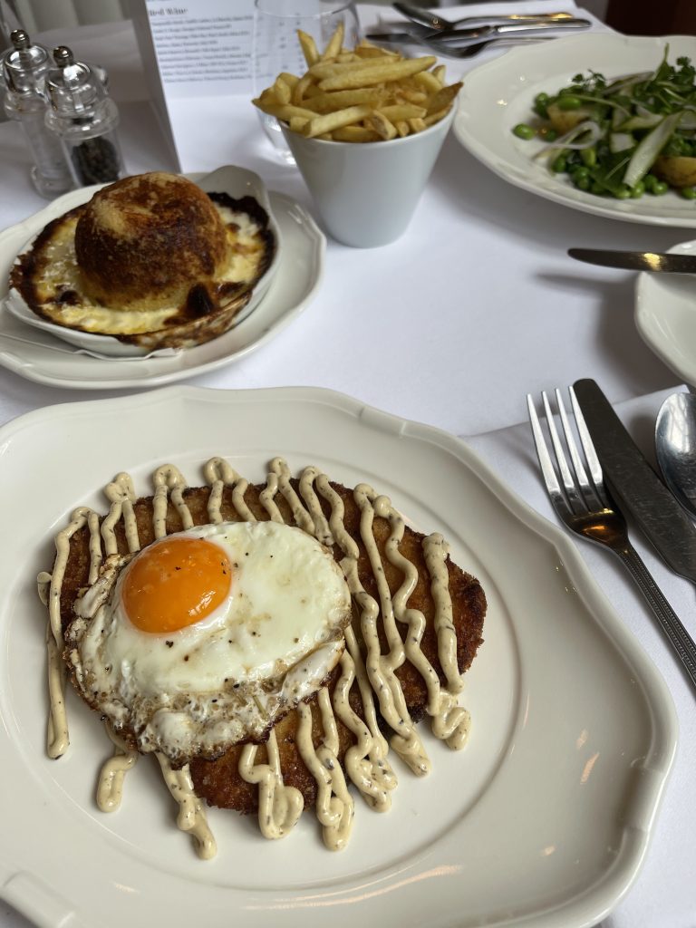 We picked a selection of dishes from the A la carte menu and asked for them to arrive as and when they were ready so we could share and graze at our leisure, something the friendly staff were more than happy to accommodate though their options that would be perfectly well suited to make up starters and mains if that’s your preference. We made a start with a light spring vegetable salad that featured asparagus, Jersey royals and peas along with heaps of refreshing mint and delicate loops of onion, then moved onto a chicken schnitzel with duck egg and truffle mayo. This did a great job of navigating numerous threats to its quality, treading the line between crispy breadcrumbs and tender interior admirably while truffle was present enough to justify headlining without taking over too aggressively.