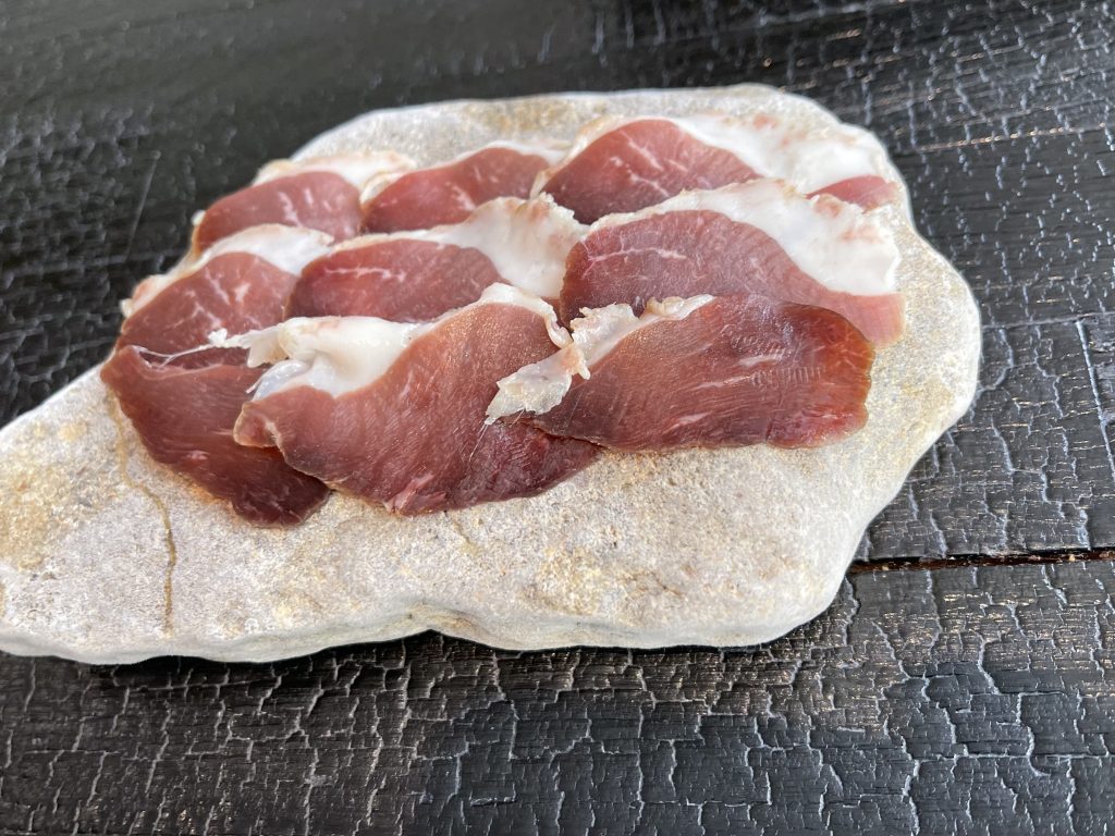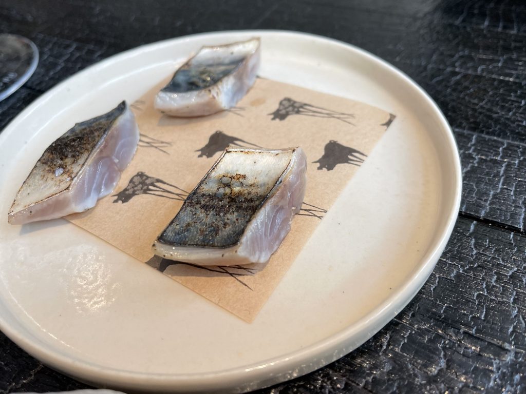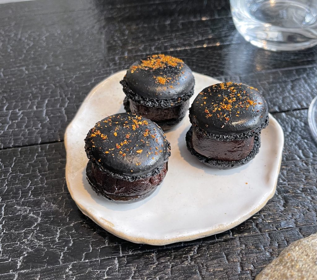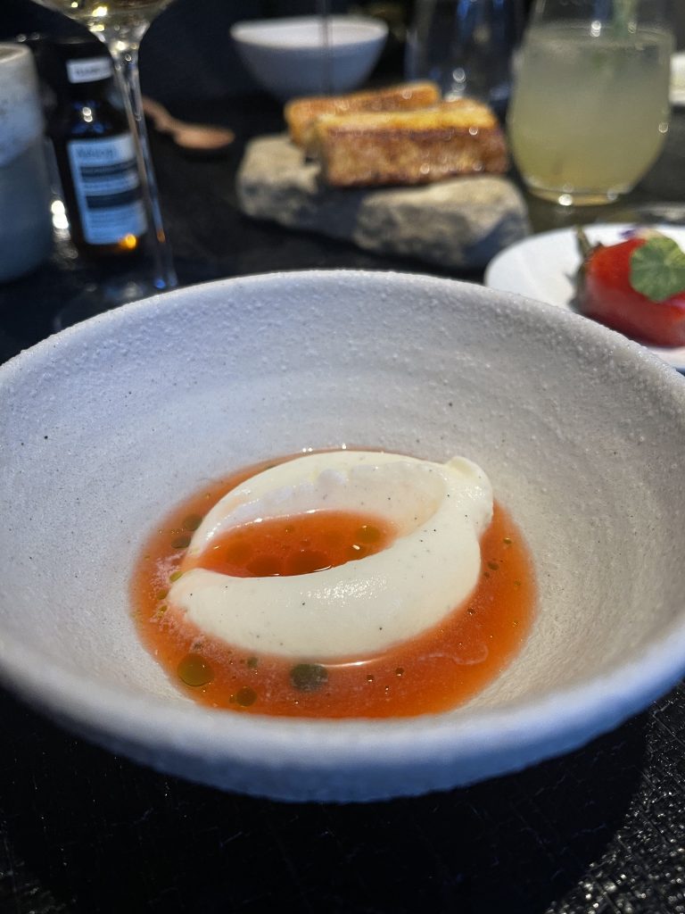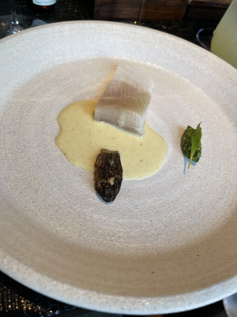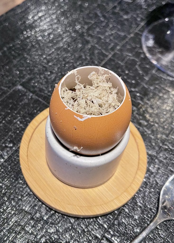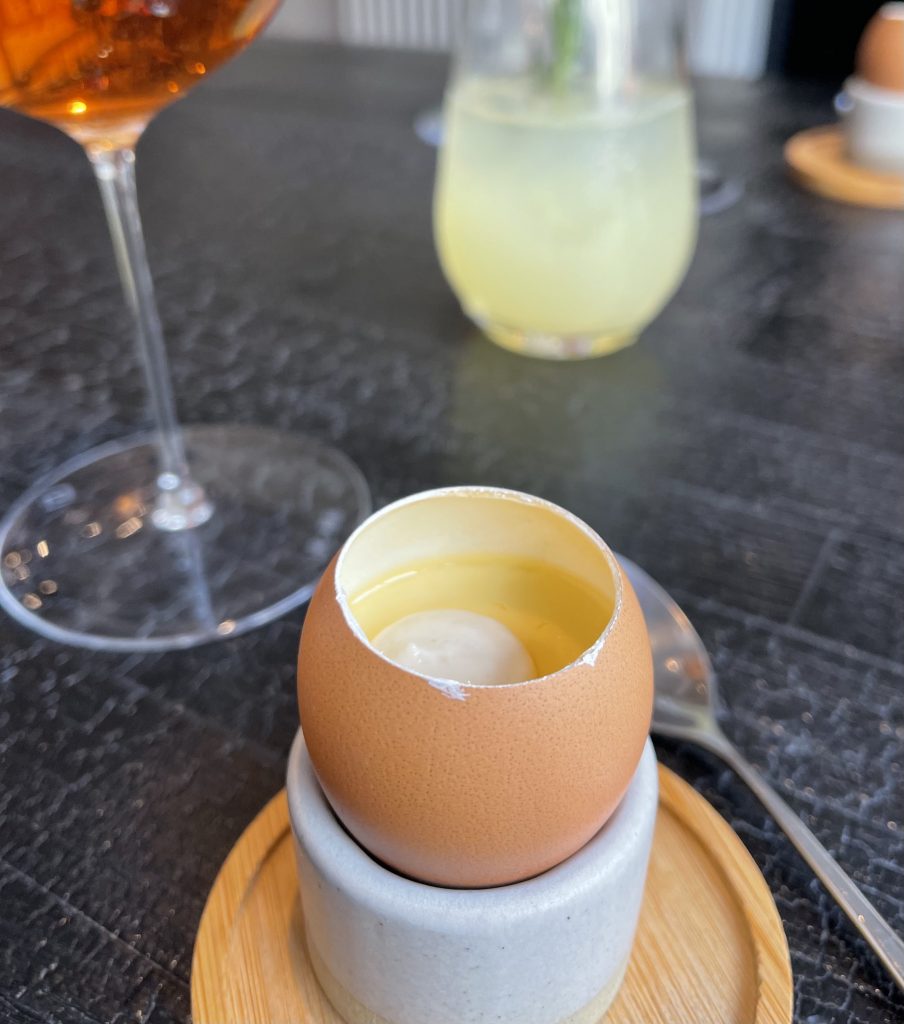 The tasting menu at Le Cochon Aveugle is served ‘Blind’ so the onus is very much on the servers to introduce the myriad dishes effectively, something achieved uniformly and effectively despite the extra complication of mask wearing. Whoever thought that elocution and received-pronunciation would be such desirable attributes outside of a career in news reading? After a refreshing and palate cleansing broth that combined mussels, wheat beer and herbs, the first few courses were single mouthfuls of goose ham from that striking cabinet and smoked mackerel as well as a much loved ‘Cochon favourite, the Boudin Noir macaron. This has been a staple of the menu both here and at sister bar Cave Du Cochon for some time and remains a delightful mouthful that balances savoury and sweet to memorable effect. An oyster and a delicately presented egg shell filled with a savoury custard complete the pre-amble with an appropriate flourish before we move on.