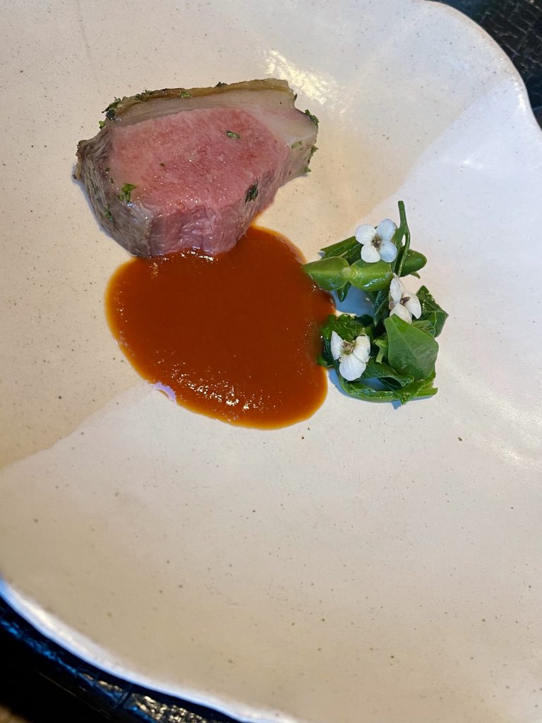 The next couple of dishes ran through asparagus served with cream that had been split with nasturtium, thornback ray cooked in lardo and a meat course of lamb delicately served with sea herbs. I’ll not get into too much detail save for too much ruination of the blind tasting concept, but suffice to say each dish embellished the flavours of the headline ingredient with delicate presentations. We enjoyed one more savoury course of richly braised lamb shoulder crepe parmentier before shifting our focus toward sweet plates.