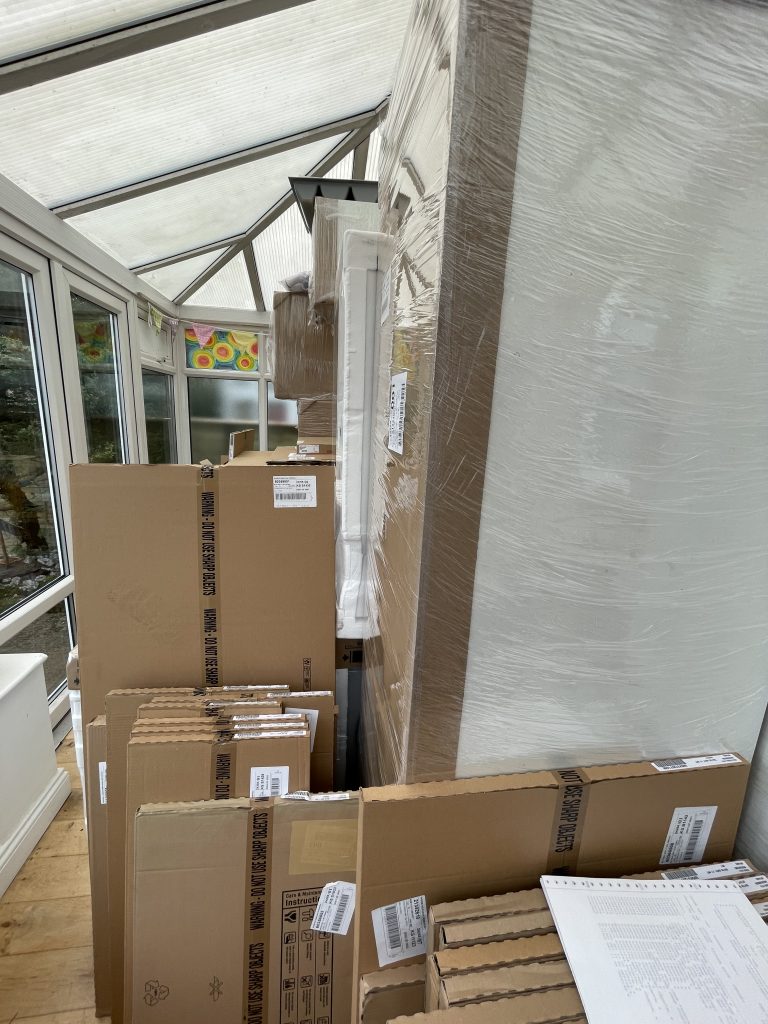 The next step was a test of nerve as the fitter came around for a pre-fit survey, checking that our measuring was at least close enough that the agreed upon design for our new Magnet kitchen would work in the space. Thankfully our numbers measured up, so to speak, and dates for delivery and installation were agreed upon. I’d little idea of the amount of space that would be needed to store an entire (non flat-packed) kitchen worth of kit and appliances, so was fairly nervous as a lorry arrived and box after box made its way into my conservatory, leaving it resembling a partially completed game of Tetris. Between that and the counter tops loitering in the hallway, the house looked fairly crowded for a few days but we just about retained access to the back door and the trip hazards on the stairs were manageable. We also relocated the fridge and kettle to the living room for a few days and arranged for now redundant appliances to go to charity. It should be noted that emptying the kitchen proved to be a predictably significant task, necessitating the sacrifice of the spare room to its contents for the duration. With all that achieved, we were ready to say goodbye to the kitchen we’d inherited upon moving into this house, which this process showed me I was surprisingly attached to after eight years of cooking.