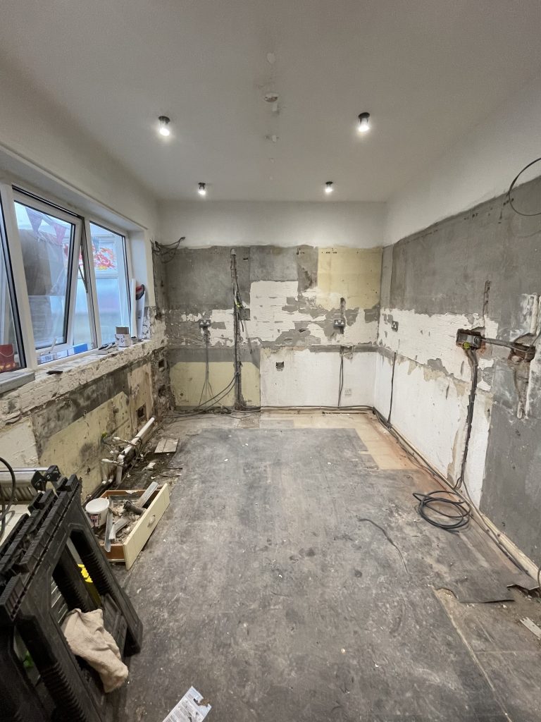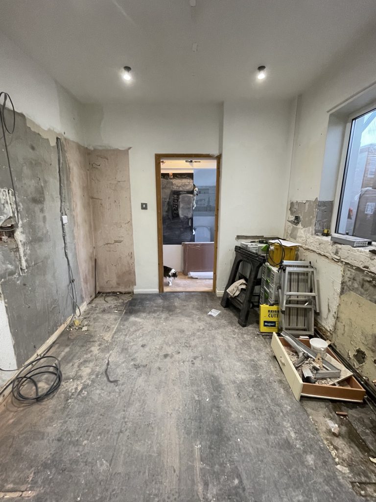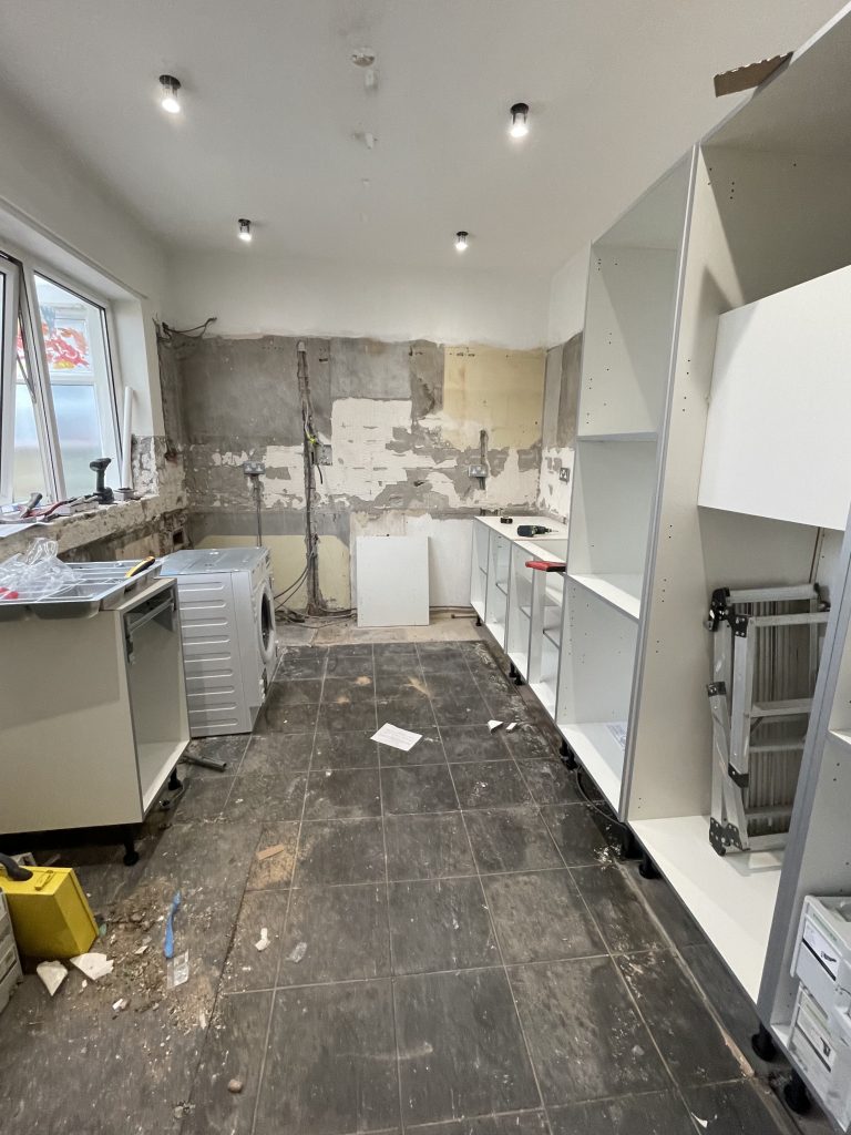 The installation of our new Magnet kitchen began with a bit of car shuffling from our very understanding neighbours to facilitate the delivery of a skip before the fitter arrived to wreak havoc upon our unsuspecting kitchen. My lack of experience of this type of project had me a little sceptical about it being possible to turn it around in a week, but the fitter was confident and in a few short hours had devastated the old kitchen, turning the room into a shell ready to crack on with. I was a little surprised to have to pay extra to chip off the existing tiles, but double digit expenses were barely registering by now given the overall outlay.