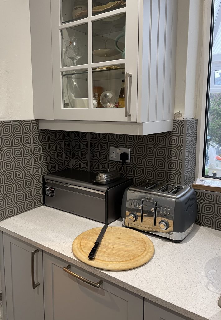 The rest of the fitting went smoothly and was indeed completed in five days flat, leaving us with a functioning kitchen ready to be tiled by the end of the week, with the skip being removed double quick too. Mess was kept to a relative minimum and the fitter was friendly and helpful throughout. We had a minor hitch when we realised a spot we’d intended to house the cats’ litter tray would be too small, thankfully that was easily rectified as the space was perfect to slip another cupboard into, though I’m still hunting for a permanent home for the cat litter, much to the kitties’ annoyance!