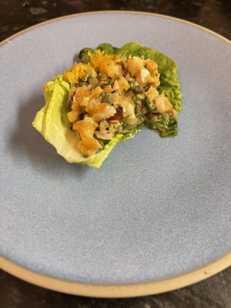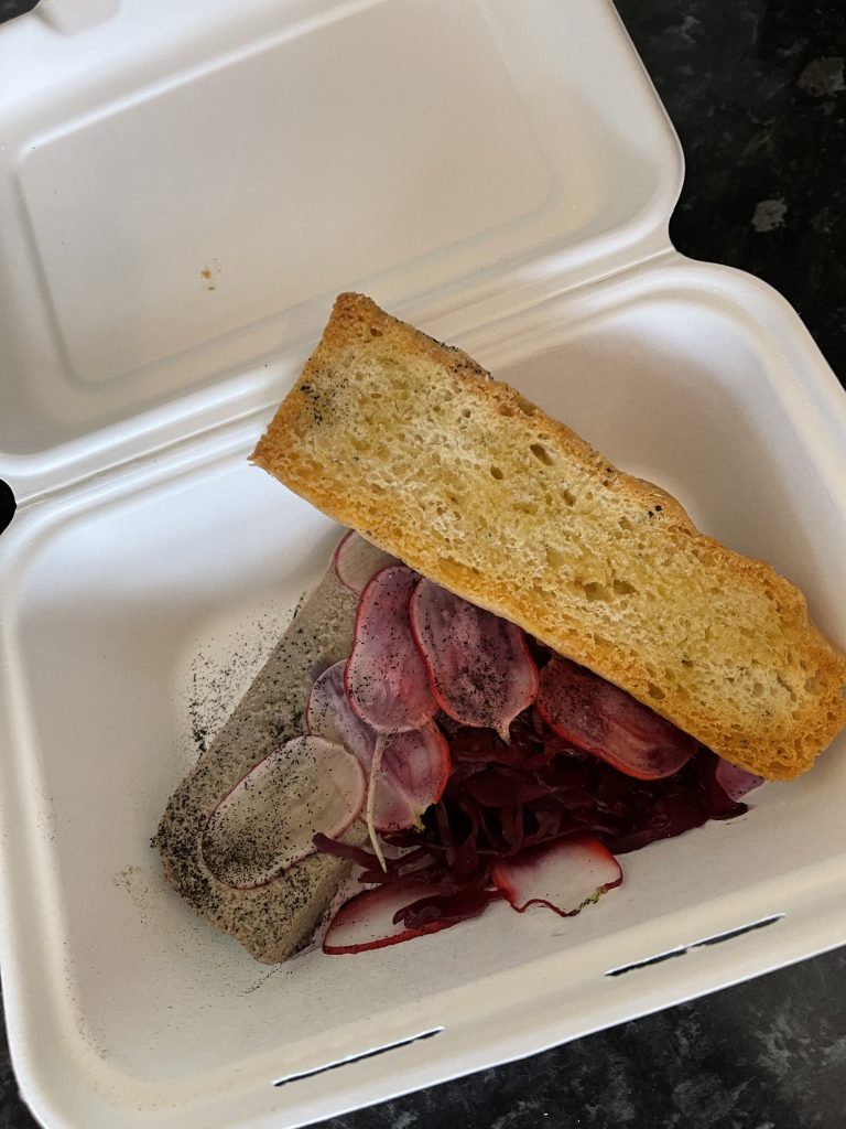We were sampling a Mother’s Day menu of two courses per person that was still appetisingly warm even after the drive from Stillington to our home in the south of York. Amongst the starters was a Salmon Tartare that I couldn’t resist which came with a hearty, well judged shot of capers, cured egg yolk and salsa verde. This one also addressed one of the presentation issues inherent with at home offerings by using gem lettuce as a vessel to contain the tartare, keeping everything in place during the transition from package to plate and then mouth. There’s not really anywhere to hide with a tartare; the balance of ingredients is really everything and the use of a bold flavour such as capers could be a trap but instead was as artfully balanced as it was presented. The other starter was a chicken liver parfait, equally well executed and presented with pickles and relish to bring it out of itself, a faultless brace of dishes to start that neatly solved some of the disadvantages of a meal transported to the home.