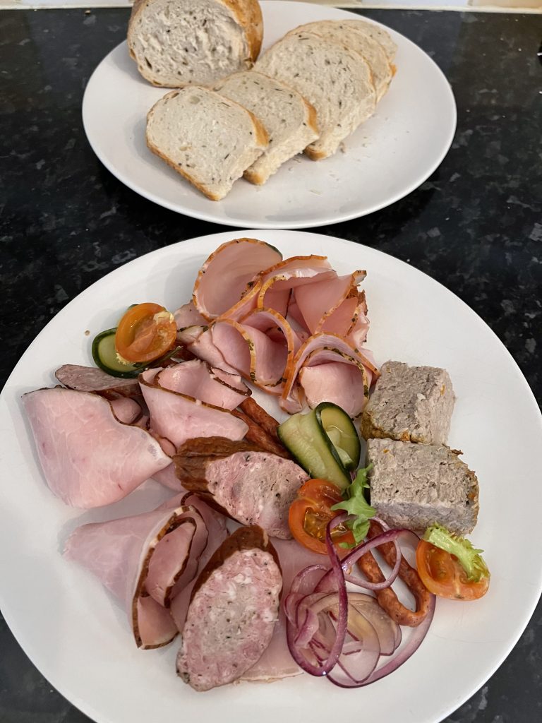 The Blue Barbakan Takeaway is available for collection or delivery through Just-Eat, though be sure to check the restaurant’s social media for offers should you order directly. At the moment that includes three courses for £20, easily one of the best value at home meals in York right now. Our delivery arrived as promised, piping hot and ready to get stuck into. To start with, we shared a platter of ham and sausage with pickles and still-warm caraway bread and a portion of their legendary pierogi, filled with spinach in this instance with a few more pickles scattered across and a soured cream dip. Obviously cold ham travels just fine but thankfully the pierogi made it in one piece too and were indistinguishable from those served in the restaurant despite the journey.