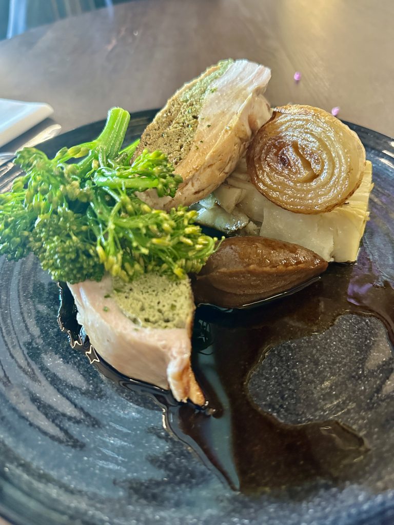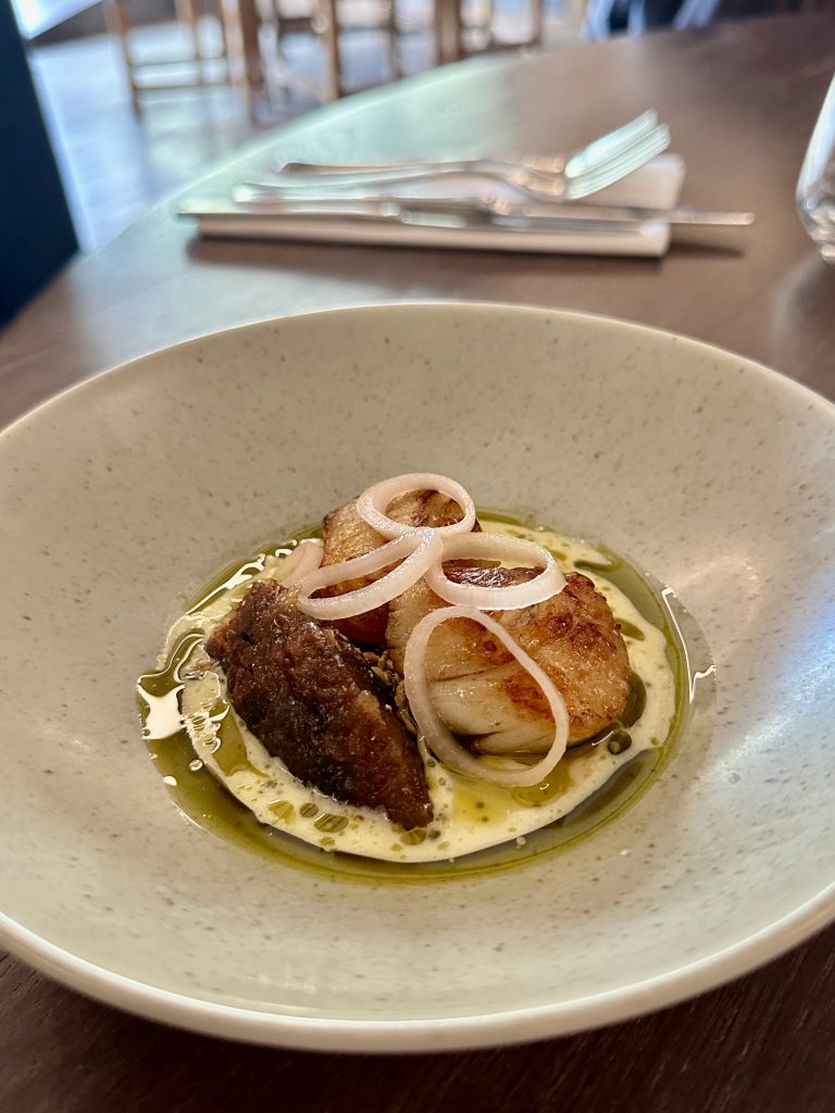 Tykes at Sandburn Hall itself is an airy and relaxed space with plenty of comfortable seating, as well as an outdoor space where some dogs were happily being exercised during our visit. We had a semi-circular booth to eat in, which let Little Fork indulge her mischievous side as she peeked over the back of it to spy on our fellow diners. The menu presents a decent range of choices, with a couple of fish and vegetarian options alongside meat dishes. I find it hard to resist a scallop, so that ended up as one half of the starters alongside a game terrine, both of which were at the table after an appropriate pause to take delivery of drinks. The sweet scallop was accented nicely by the bacon jam and given a touch of sharpness from the pickled shallot rings that adorned it, while the dill notes in the cream sauce added freshness. This wasn’t reinventing the wheel unnecessarily, and was well executed and delicious. The game terrine came enrobed in leek and topped with gently pickled baby carrots with crisps of brioche for texture, as well as elements featuring sage and prune. The earthy notes all came through strongly, and I liked the coarse texture of the terrine, all of which added up to another solid dish doing a good job of showcasing what it promised.