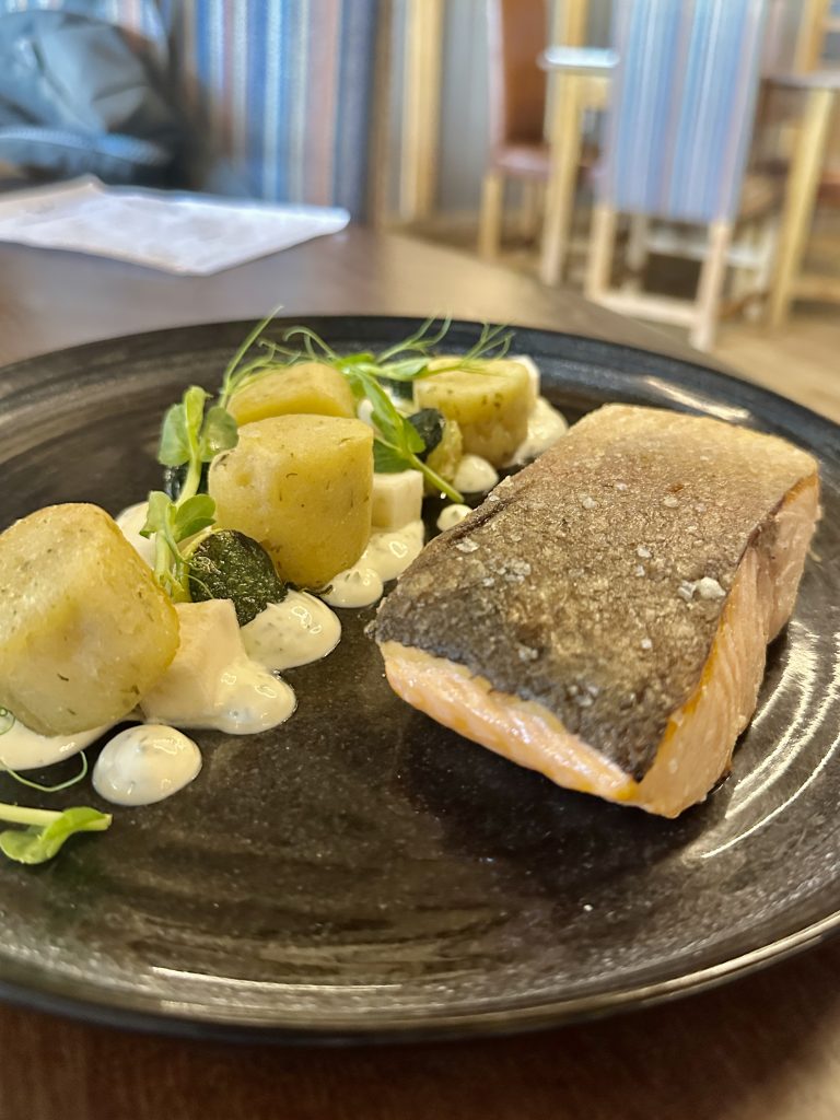 From the ten or so main dishes on offer we plumped for one fish and one meat, with chicken and salmon supremes pushing their respective chests through the tape first. The chicken supreme came with confit onion, onion puree and pomme Anna with some broccoli for a fresh note. Tender chicken did the job nicely and there were notes of truffle to enjoy but the star was the onion; simple things cooked nicely are always going to do it for me. The salmon teamed up with well constructed lemon and dill gnocchi, hemispheres of courgette and a creme fraiche-based sauce coming up with a well resolved balance of freshness and indulgence. With a Bar Billiards match to get back to in the centre of York, we didn’t linger long but did have time to put away affogato for dessert.