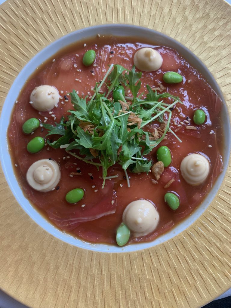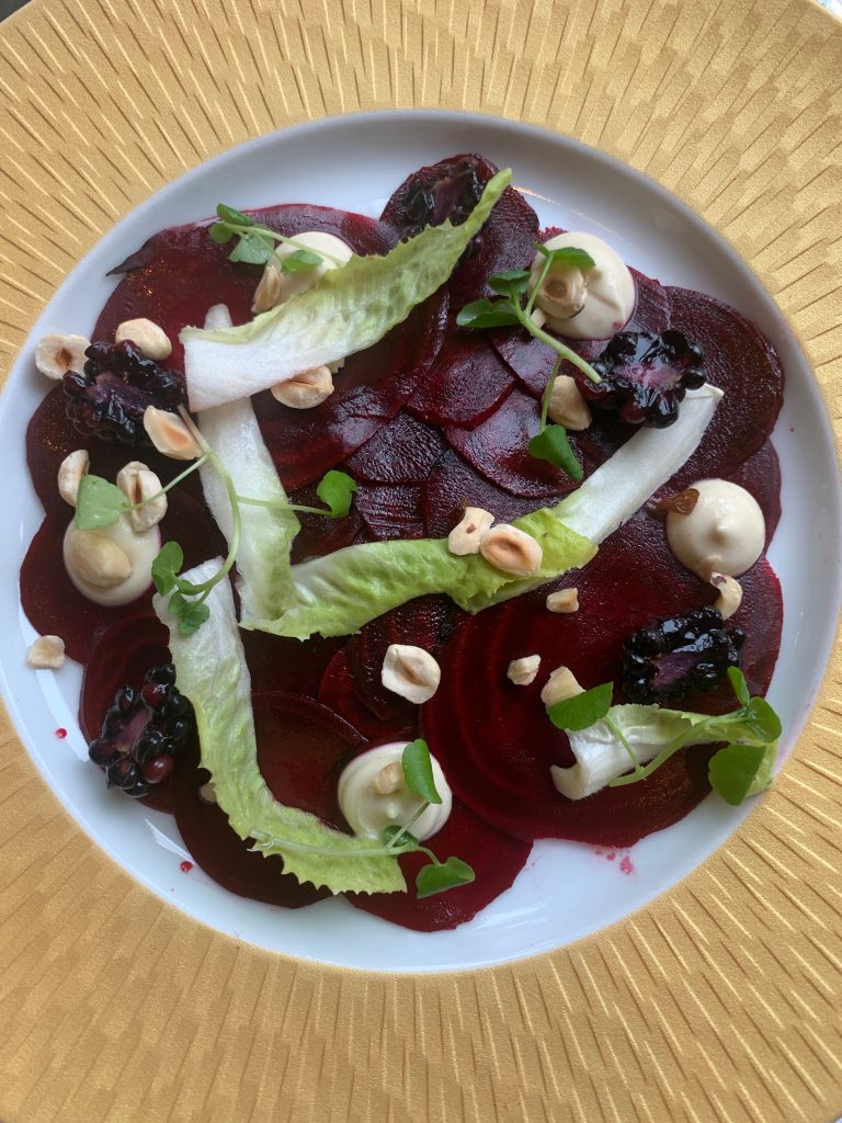 To start we’d coincidentally gone for what I would guess are the two flattest starters on the menu, carpaccios of beetroot and tuna respectively that were both presented as compellingly as you’d expect. The beetroot relied on a red wine dressing and horseradish to bring out the best of the main ingredient along with blackberries and hazelnuts for texture. With beetroot being occasionally underrated, this was a dish to let it shine, the thin slices being left with plenty of bite still. The tuna was one of the most memorable starters of 2020 (admittedly a smaller field than usual) which prompted some minor needling over equitable sharing thanks to the generous punch of citrusy ponzu dressing and tangy miso mayonnaise. A good carpaccio is a great pleasure, and this was a great carpaccio that delivered more than I hoped as it moved us forward toward the next course.