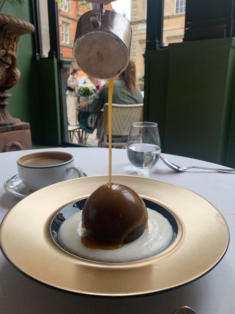 Never on any of my visits to The Ivy have I quite got around to ordering the signature Shepherds Pie, so thought I’d take this opportunity to right that wrong while settling on a grilled sea bass fillet to satisfy the other side of the table. Served as a cylinder daubed with piped mash to create a topping, it was easy to see how this has become emblematic of The Ivy thanks to a handily balanced mix of comfort and refinement. A simple fillet of fish doesn’t leave much space to hide when cooking and indeed there was nothing for the accompanying pesto to attempt to hide. With some indulgent truffle mashed potato on the side and green veg to flesh it out this all added up to a meal with a real sense of occasion. Another Ivy staple that’s never quite made it as far as my plate is the Chocolate Bombe so I made a point of taking this opportunity to tick that off too, enjoying the slightly silly bit of theatre it arrived with as our server melted the chocolate sphere at its centre with a hot caramel sauce to turn the whole thing into a densely sweet puddle incorporating chocolate, vanilla ice cream and honey comb.