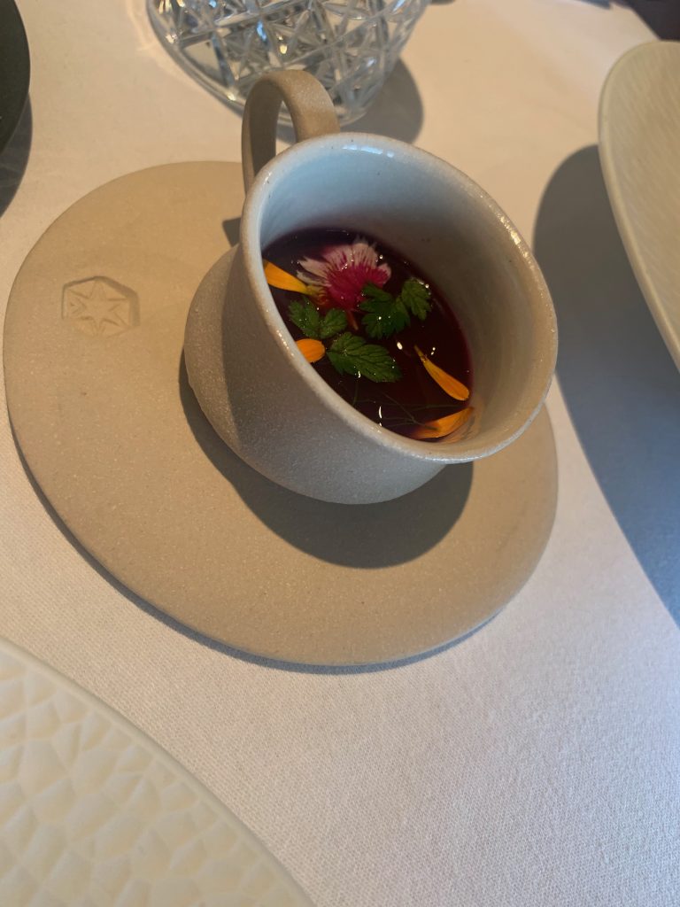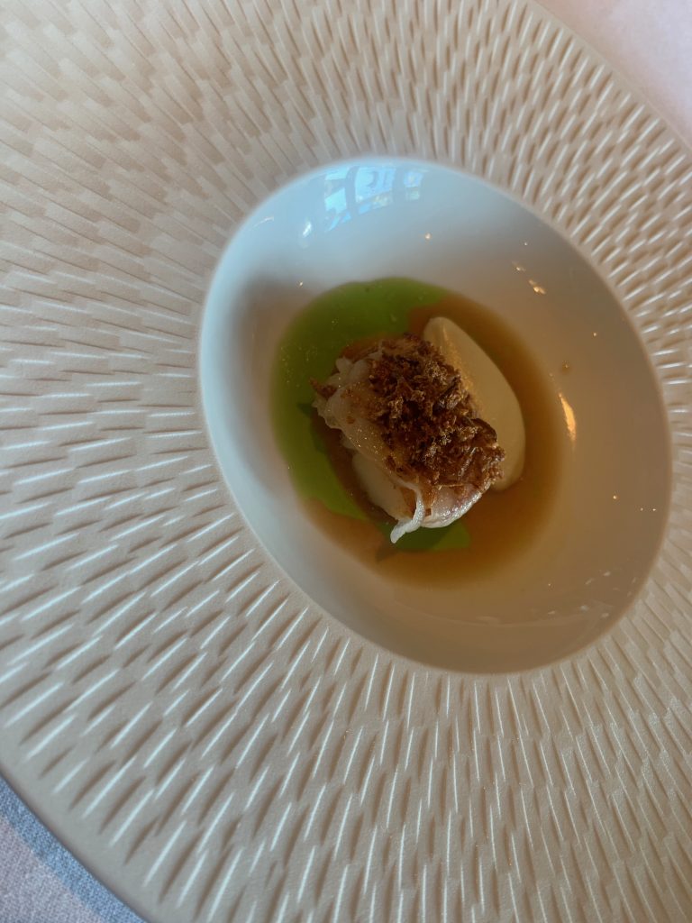 Octopus was slow braised and coal roasted before being served with a “Goose Fat White Bean Whip”, black cabbage and studs of bold chorizo. Well cooked octopus is a joy, as was this dish which was a luxuriant start to the meal proper with the fatty “whip” balancing with the chorizo heat perfectly and the octopus given plenty of space to breath. Halibut tartare was inevitable as soon as I realised there was something raw on the day’s specials menu and didn’t disappoint with a heady combination of black garlic, pommery mustard and cured egg yolk drawing every ounce of potential out of the fish. This came accompanied by a shot of red cabbage gazpacho delicately balanced with herbs and happily refreshing. Next up was a mid course of scallop with a deeply nuanced dashi that kept up the meal’s momentum beautifully.