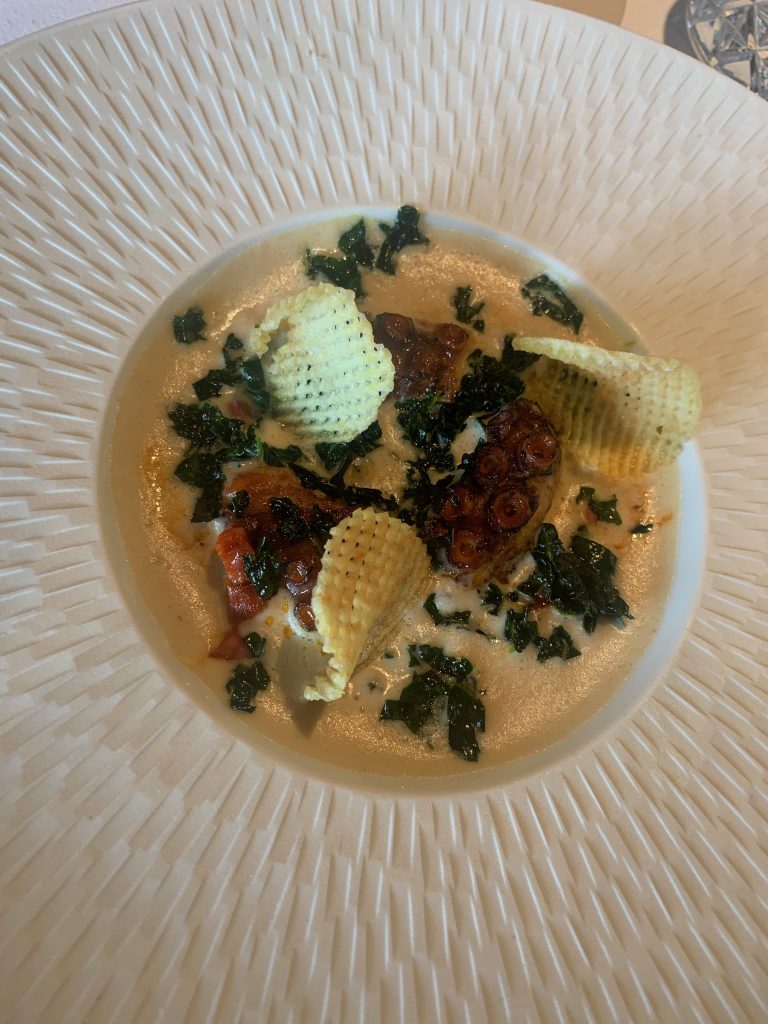 We kicked off with a few snacks, including Lindisfarne oysters with a sorrel and elderflower dressing, mini game kebabs and mini potato & onion pie with black garlic ketchup. Oysters don’t feature toward the top of too many of my to-do lists but when they’re as fresh and well accented as these I’ll happily live with them. The pie was artfully constructed and packed powerful overtones of black garlic and the cute mini game kebab brought aioli and fermented cabbage into the mix for a well developed mouthful to finish on before we began on starters, for which we’d chosen octopus and halibut.