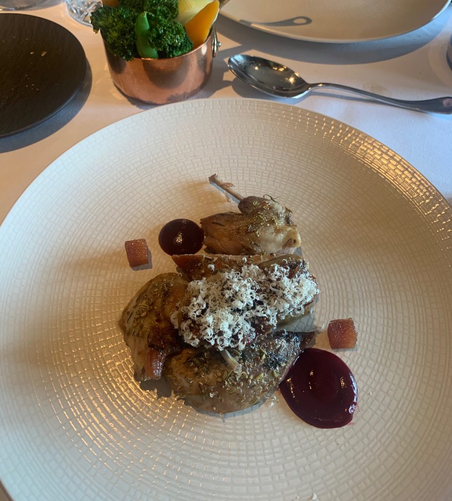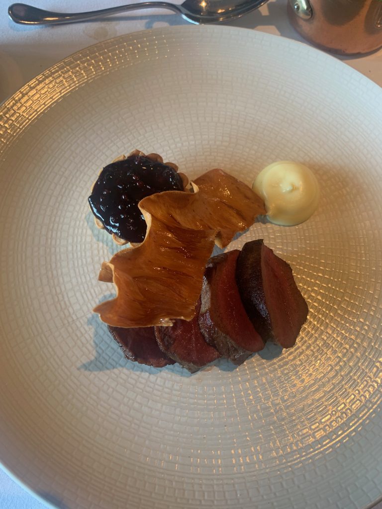 For mains we went with locally shot Fallow Deer and Rievaulx Partridge, zeroing in on the sense of locality central to the Star’s offering. The partridge came with smoked beets and quince as well as spiced fruit and nuts for a delicately balanced plate of food featuring this relatively rare meat. The Deer pushed things up another notch too with perfectly cooked loin joined by parsnip and an elderberry topped “Pluck Tart”, which will ensure that this dish remains in my memory for a long time. While the meat had been treated with the utmost care and was beyond reproach, the tart paired a deeply flavoured earthy, gamey filling with huge flavour that never threatened the balance of the element, particularly being reigned in by the elderberries. The key question of this was the constituent of the tart’s filling, which perhaps is best left mysterious for those particularly squeamish, suffice to say it was “offal-y good”.